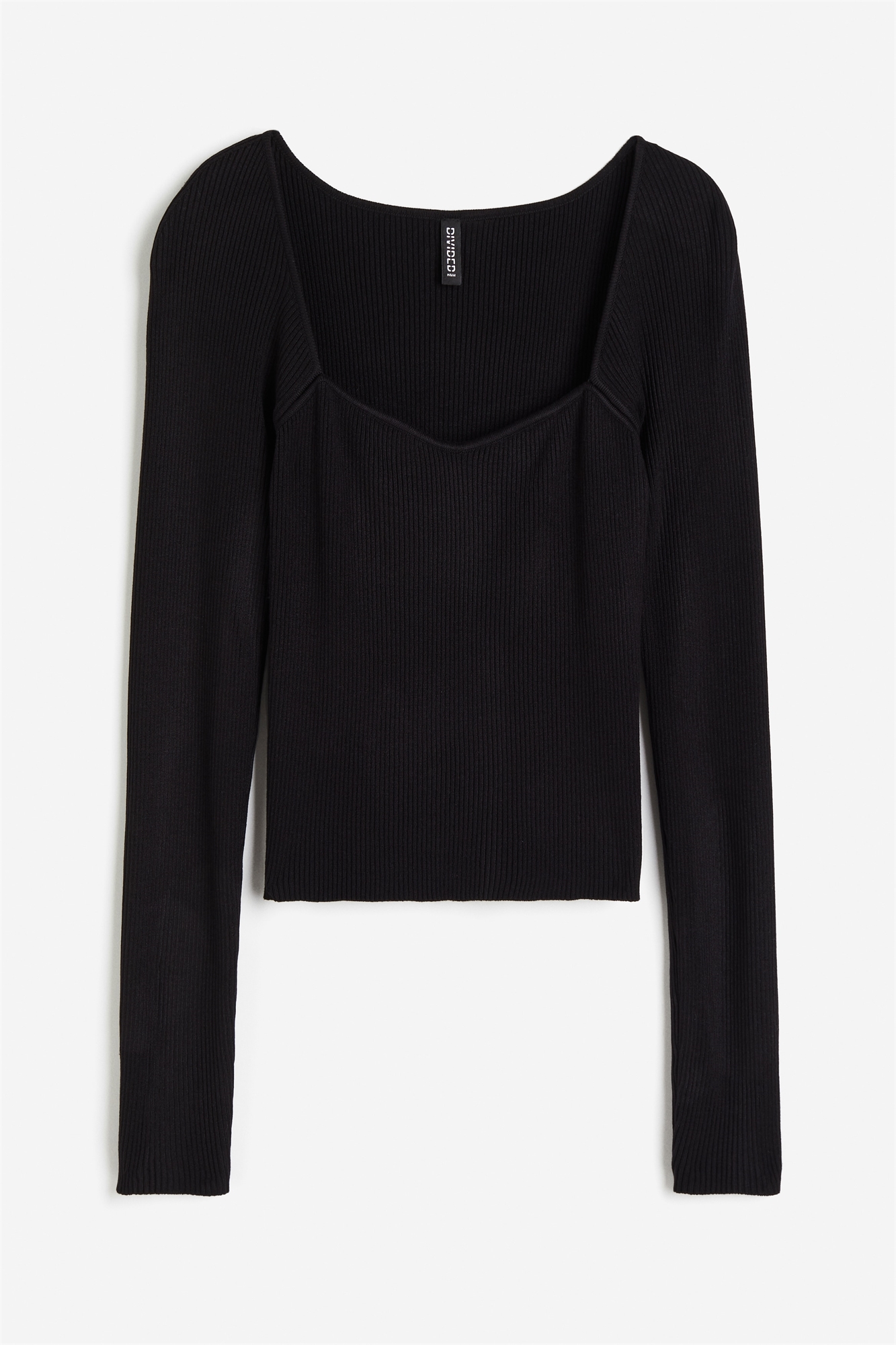 Облегающий топ из мягкого трикотажа в рубчик с вырезом "сердечко", длинными рукавами реглан и прямым подолом.