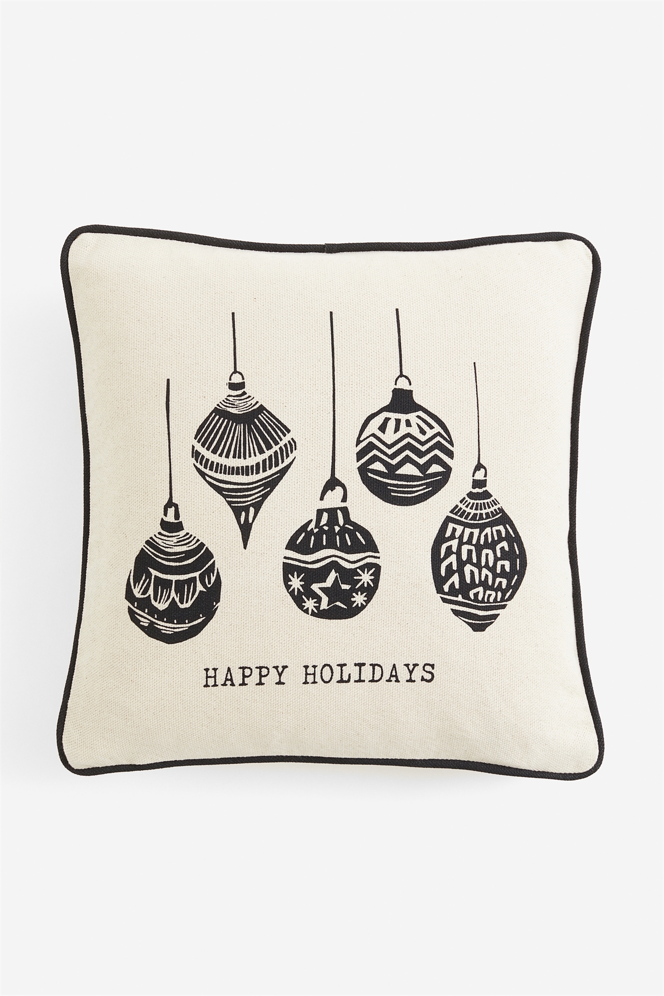 Чехол для подушки из хлопкового канваса с принтом в виде рождественских мотивов и окантовкой в тон. Застежка-молния с одной стороны.