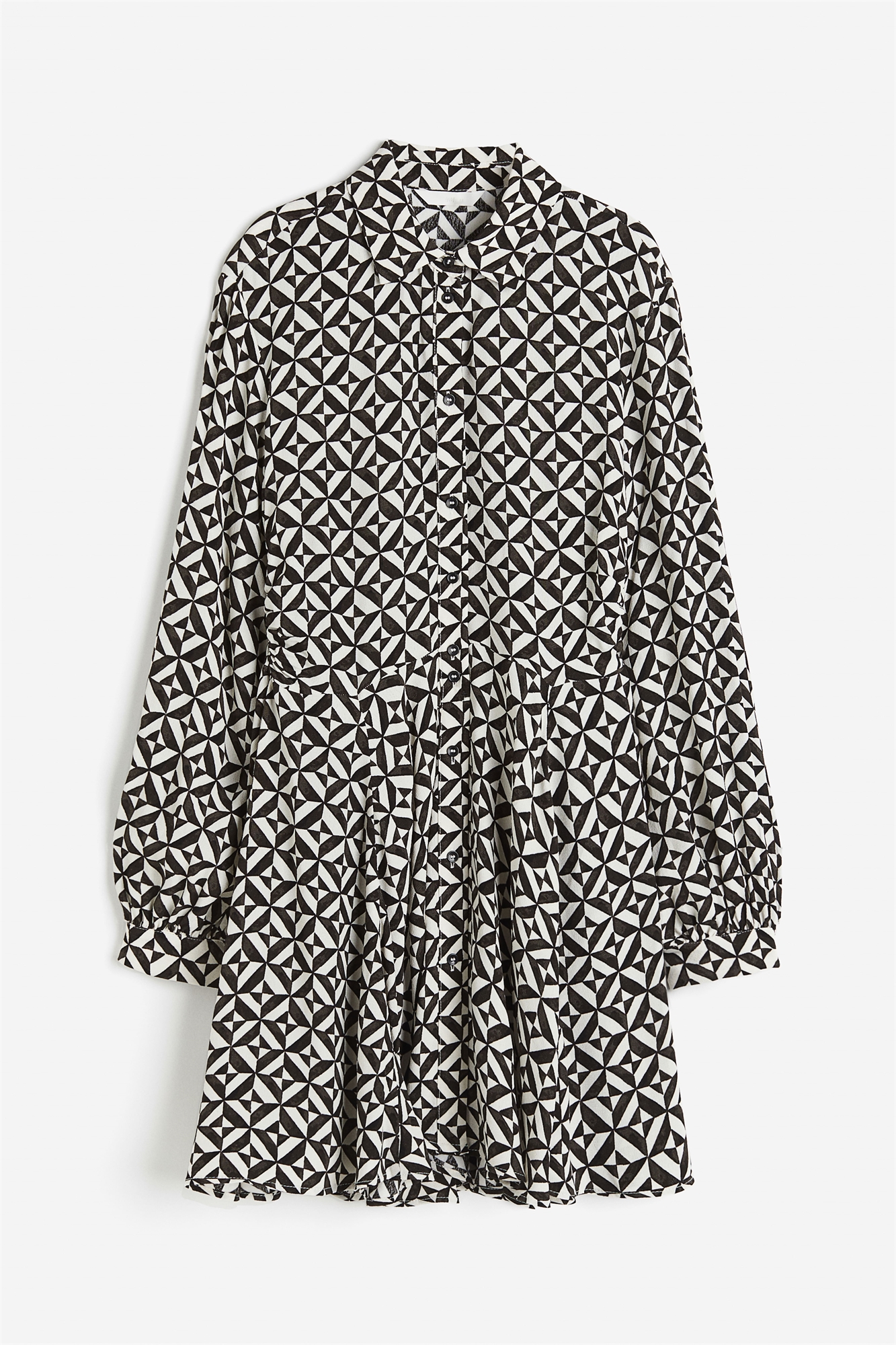 Короткое платье из вискозного крепа с воротником и пуговицами спереди. Слегка спущенные плечи, длинные рукава-баллоны с манжетами на пуговицах, приталенный лиф и расклешенная юбка. Без подкладки.