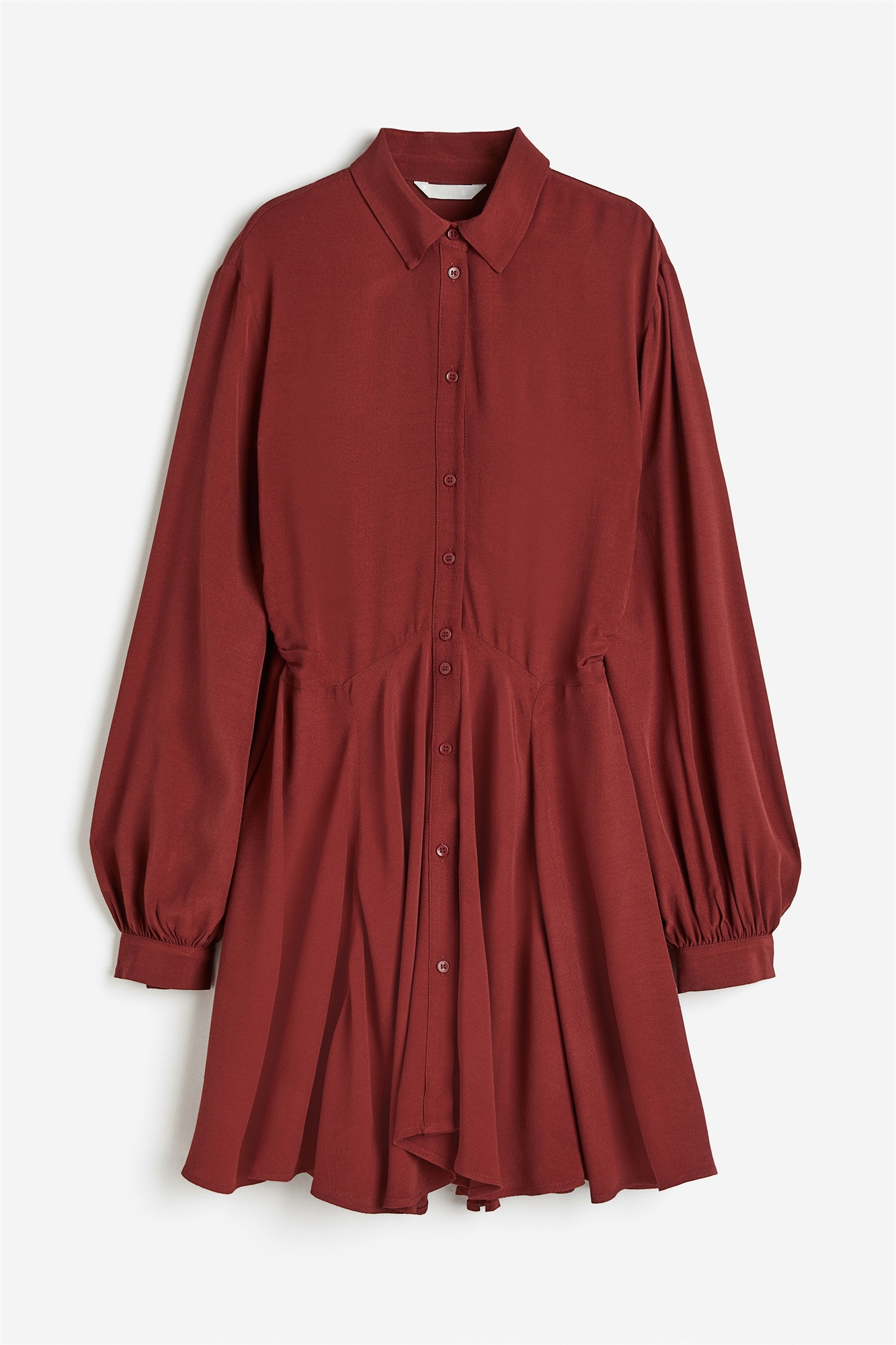 Короткое платье из вискозного крепа с воротником и пуговицами спереди. Слегка спущенные плечи, длинные рукава-баллоны с манжетами на пуговицах, приталенный лиф и расклешенная юбка. Без подкладки.