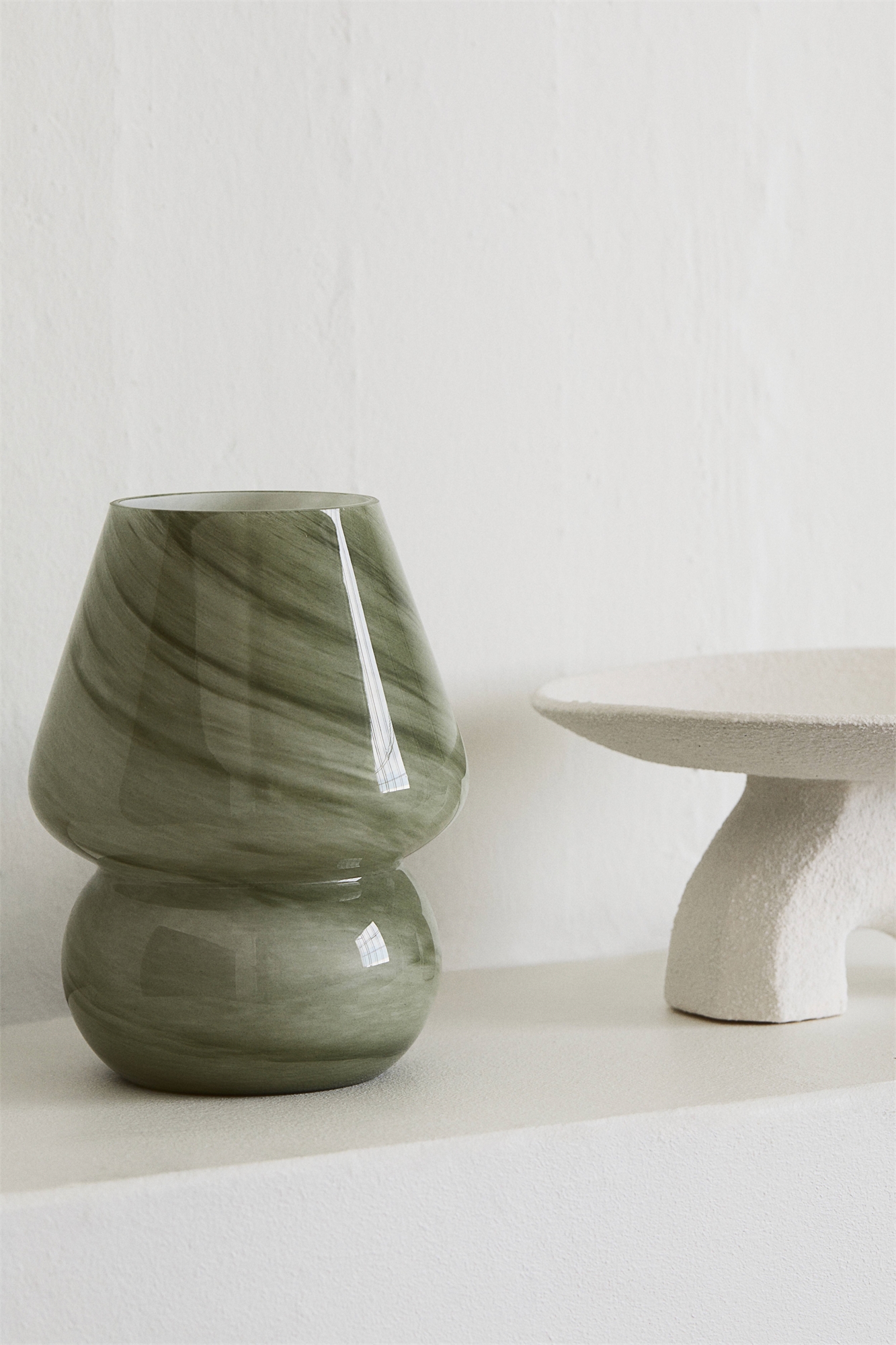 Настольная лампа из цветного стекла, распространяющая мягкий свет и создающая теплую атмосферу. Кабель с пластиковым выключателем. Для лампочек с цоколем E14. Максимальная мощность 6 Вт. Лампочка в комплект не входит. Наибольшая ширина 15 см. Высота 18,5 см.