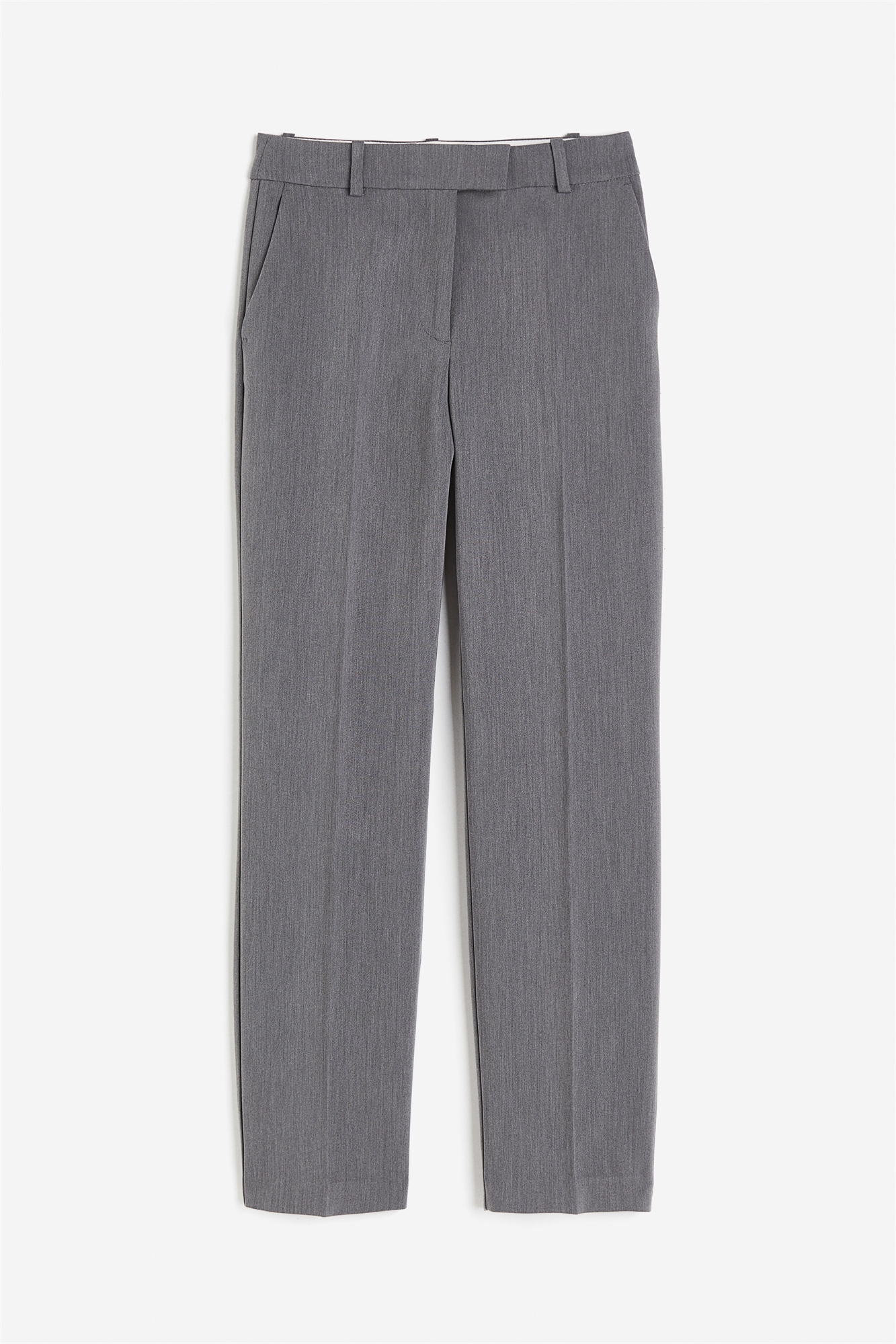 Приталенные брюки из саржи с высокой талией, ширинкой на молнии и удлиненным поясом со скрытой застежкой на пуговицу и крючок. Диагональные боковые карманы, фальшивые втачные карманы сзади и зауженные прямые ноги со складками спереди и сзади.