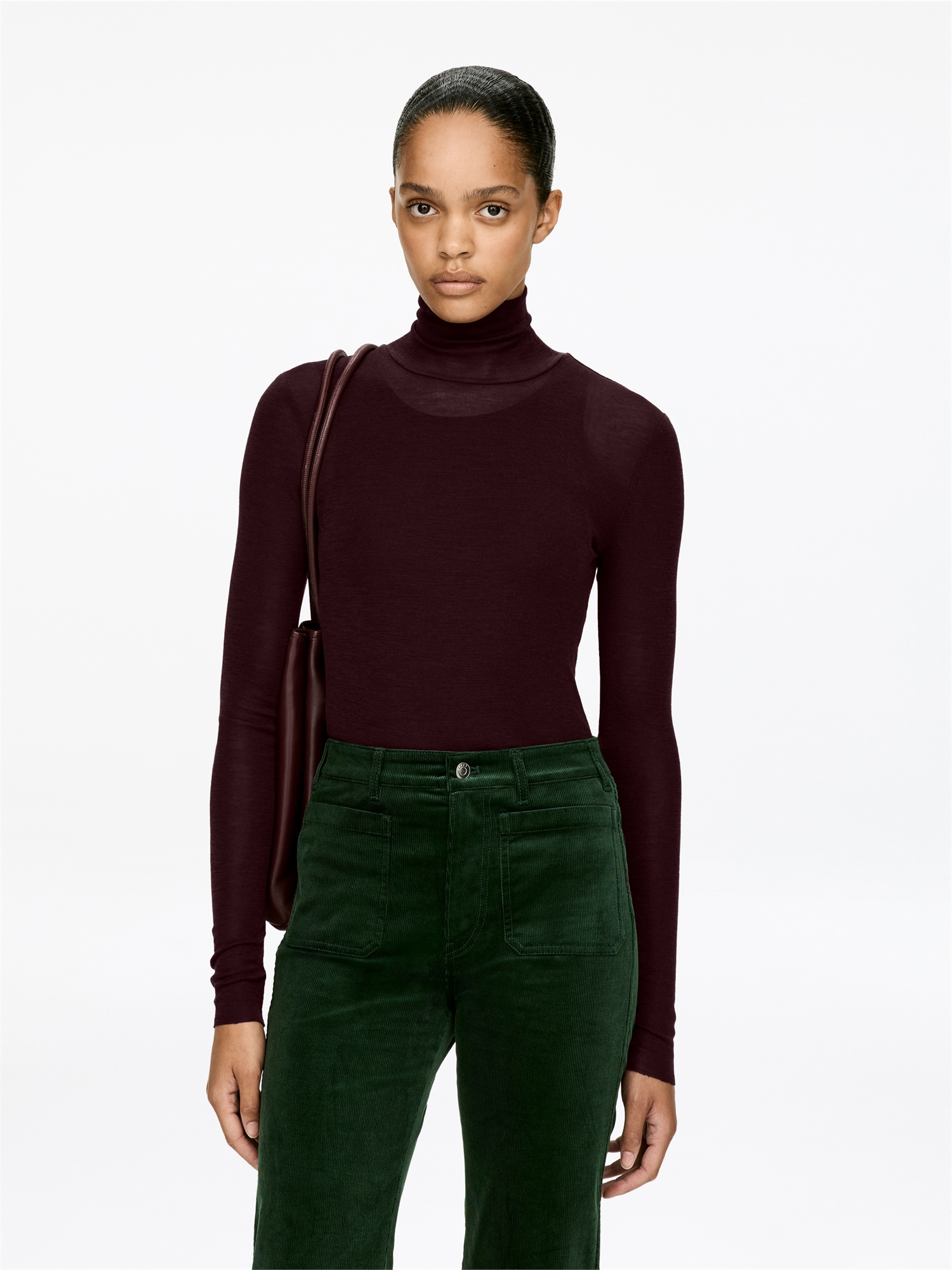 Топ из джерси с длинным вырезом, вязаный из чистой мериносовой шерсти. Манжеты, горловина и низ подола обработаны необработанными краями. Этот топ содержит 100% шерсти RWS, сертифицированной контрольным союзом 893290. Изделия, сертифицированные по стандарту ответственной шерсти (RWS), содержат шерстяное волокно с ферм, прошедших независимую сертификацию на соответствие требованиям по благополучию животных и землепользованию.