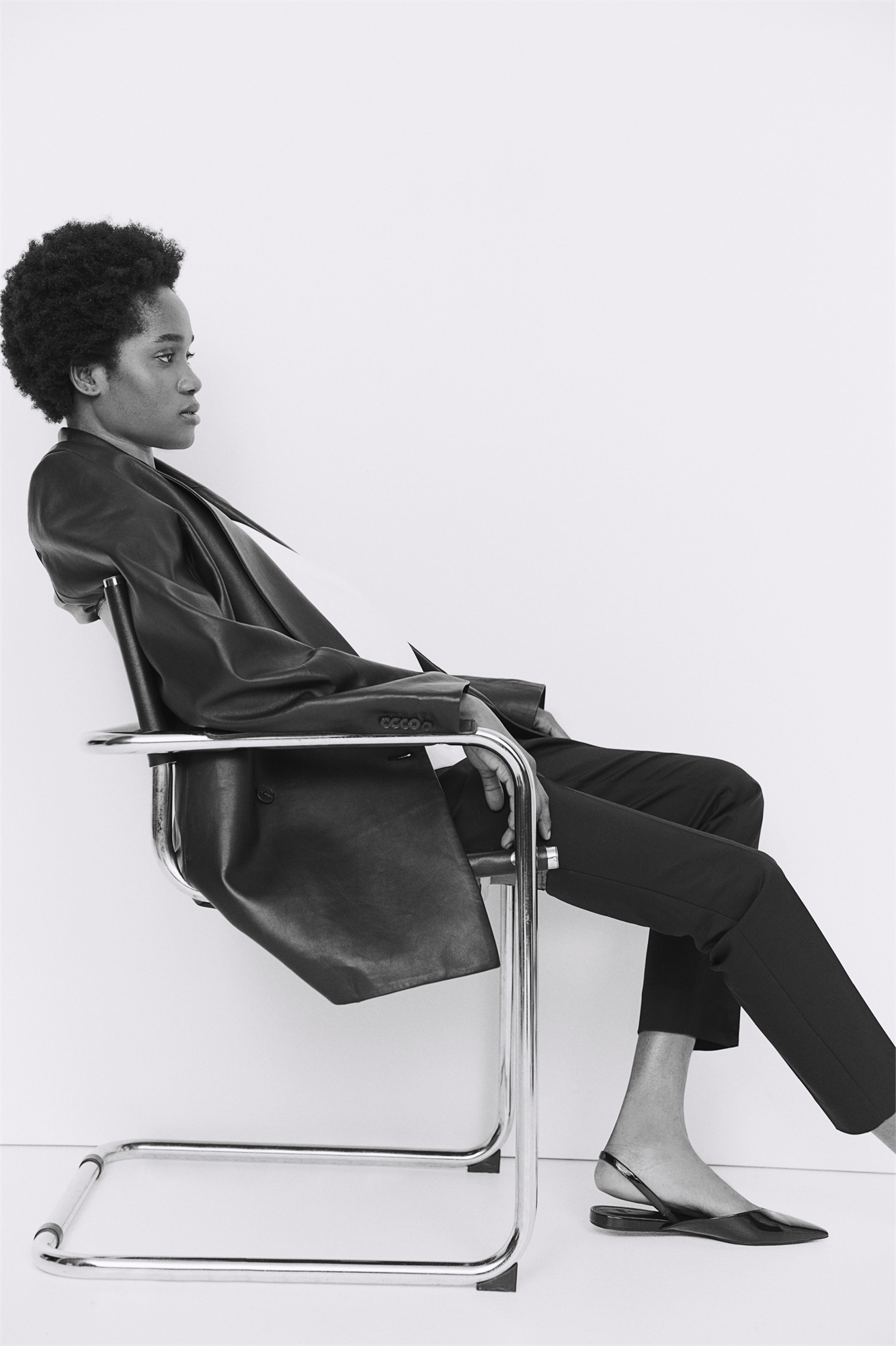 Брюки длиной до щиколотки из тканого материала с зауженными ногами со складками, неброскими боковыми карманами и фальшивыми карманами сзади. Заниженная талия, ширинка на молнии, потайная застежка на пуговицах и крючках. Скрытая регулируемая резинка в поясе, благодаря которой можно регулировать ширину талии, что позволяет носить брюки как во время беременности, так и после нее.
