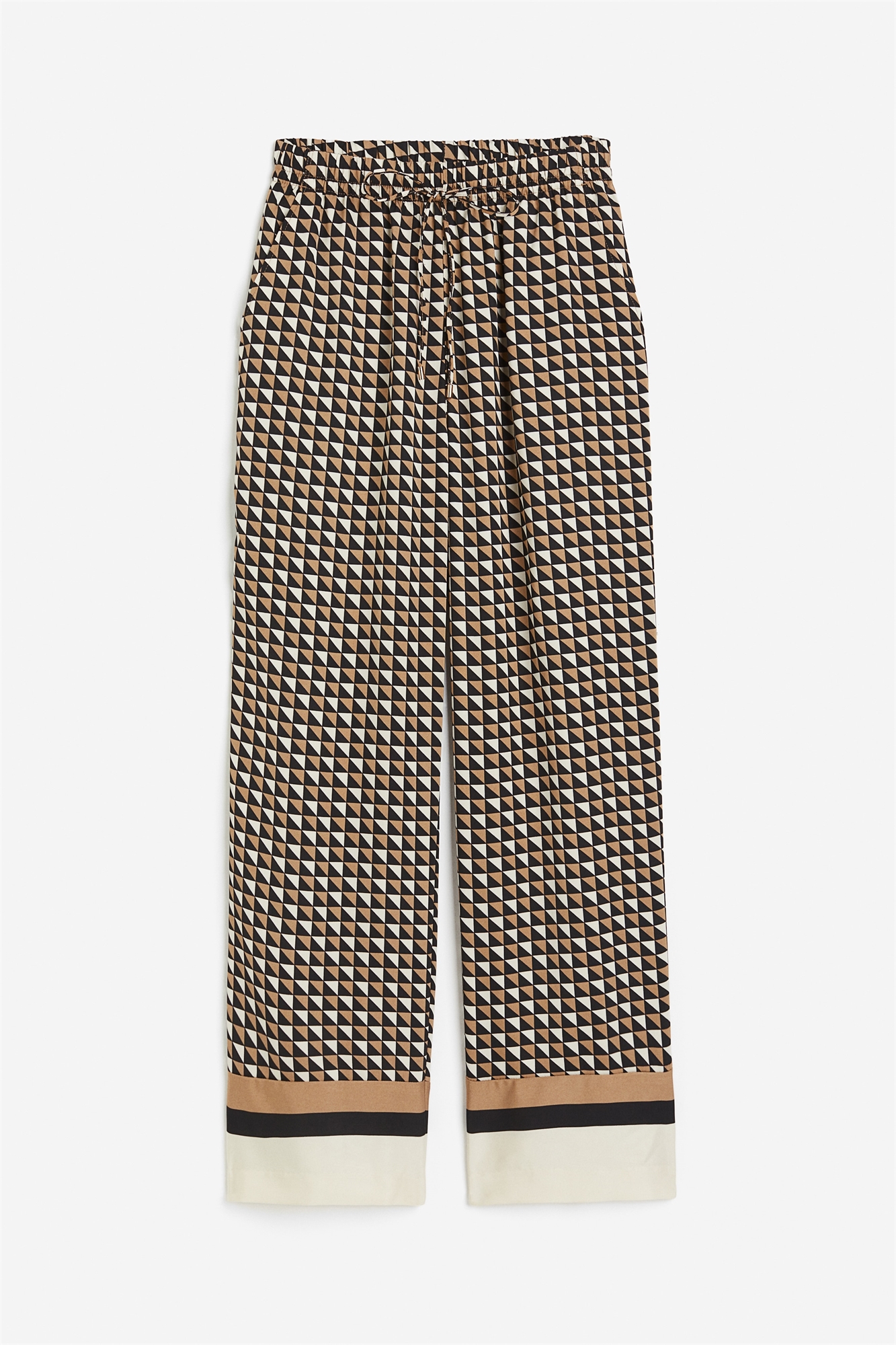 Брюки из саржи с высокой утягивающейся талией, диагональными боковыми карманами, фальшивыми карманами сзади и широкими прямыми ногами.