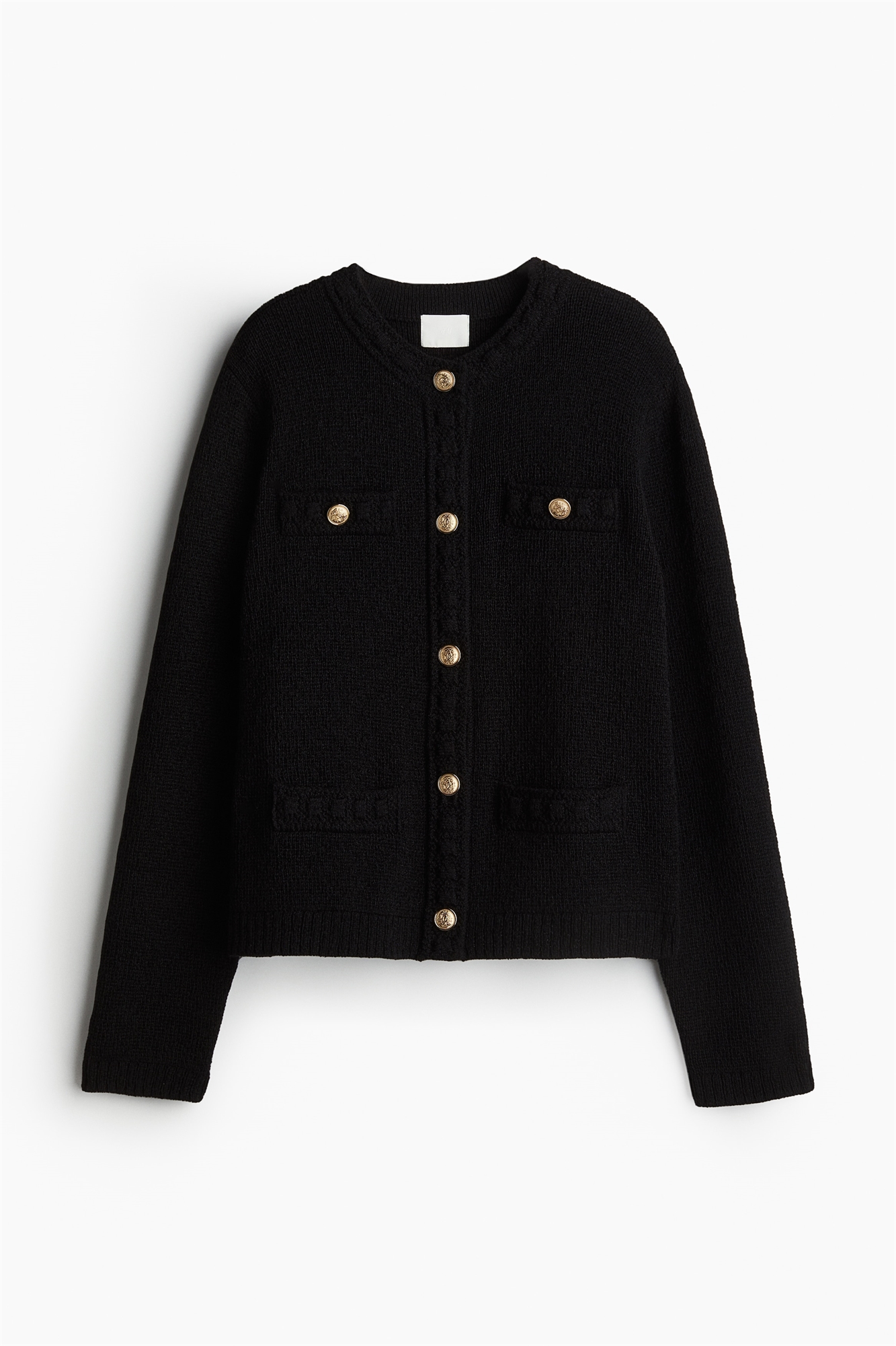 Короткий кардиган из фактурного трикотажа с круглым вырезом и металлическими пуговицами спереди. Длинные рукава и втачные карманы на груди и спереди.