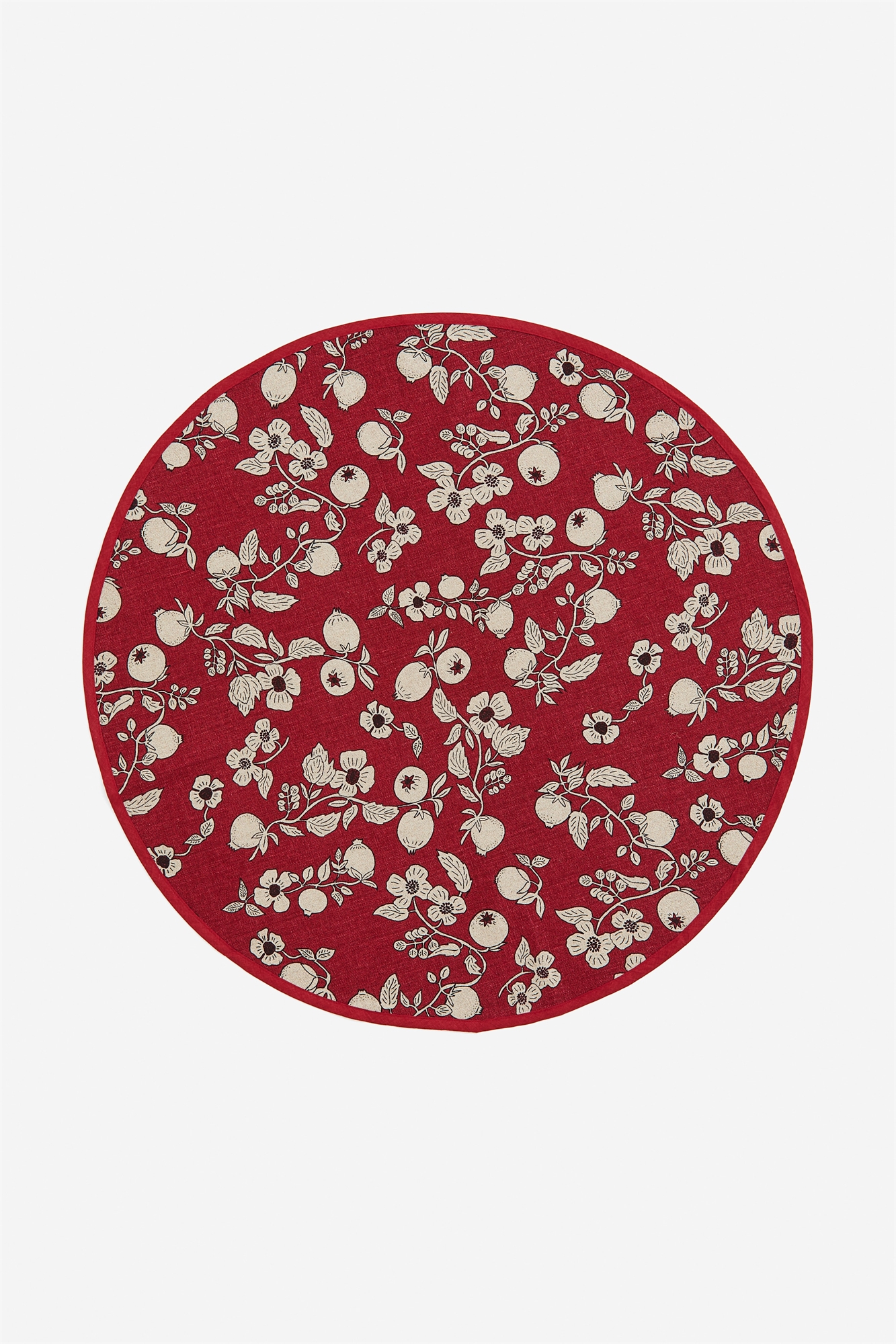 Круглый елочный коврик из льняной/хлопковой ткани с принтом по всей поверхности и окантовкой.