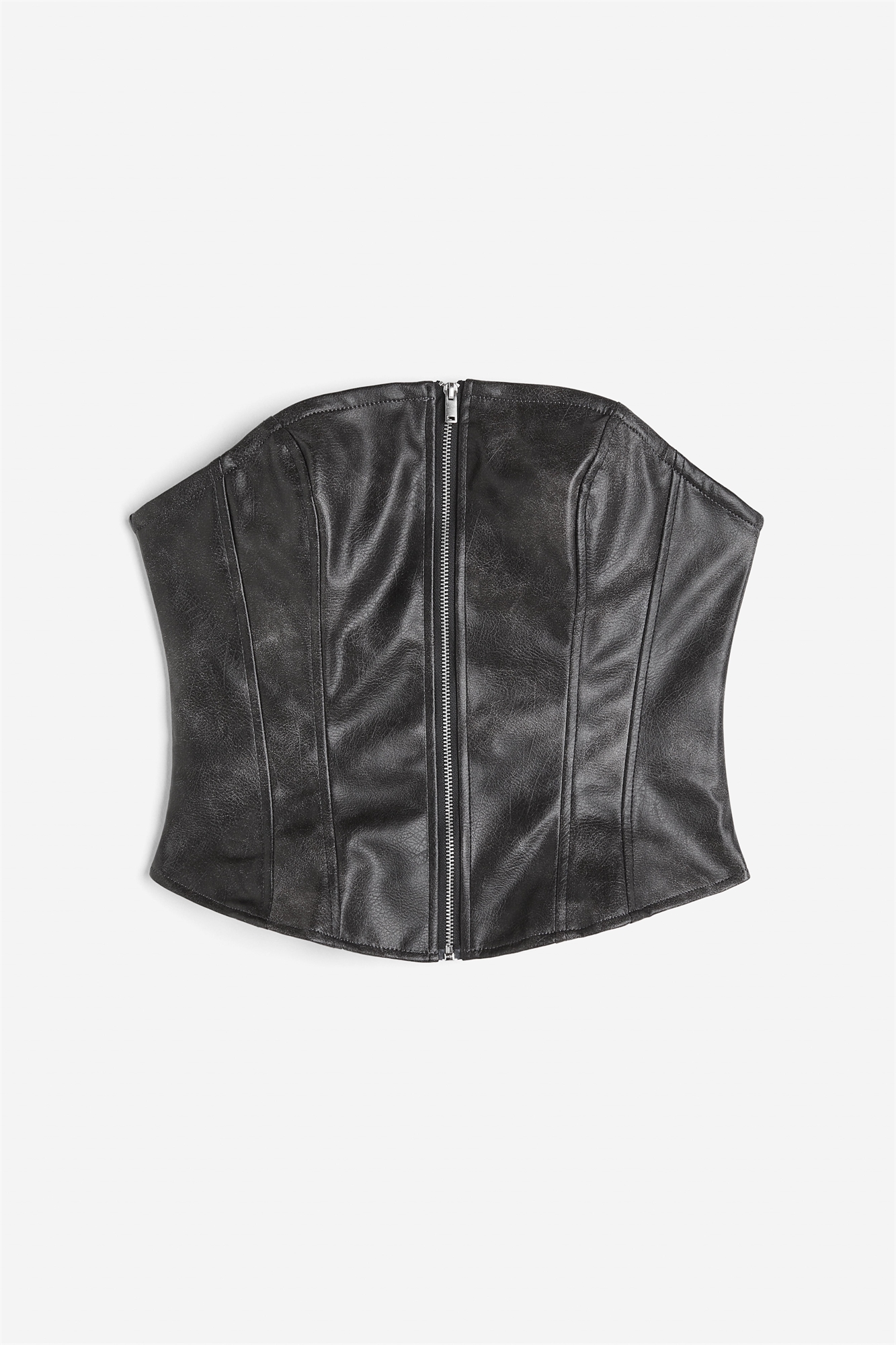 Короткий корсетный топ-бандо из ткани с покрытием, скрытой силиконовой отделкой в верхней части, застежкой-молнией спереди и деталями в виде косточек спереди и сзади. Подкладка из джерси.