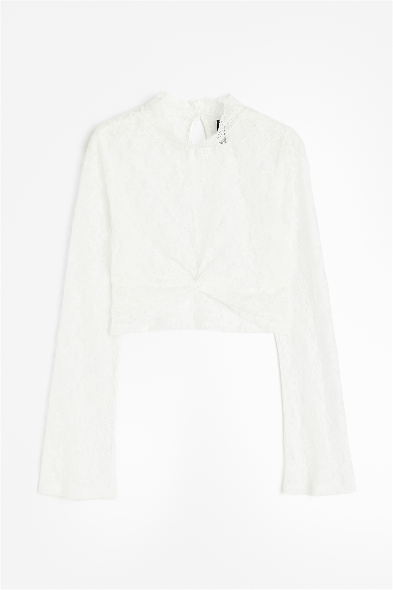 Короткая, облегающая фигуру кружевная рубашка с длинными рукавами, воротником-стойкой, разрезом на пуговицах и декоративной деталью в виде узла спереди. Без подкладки.