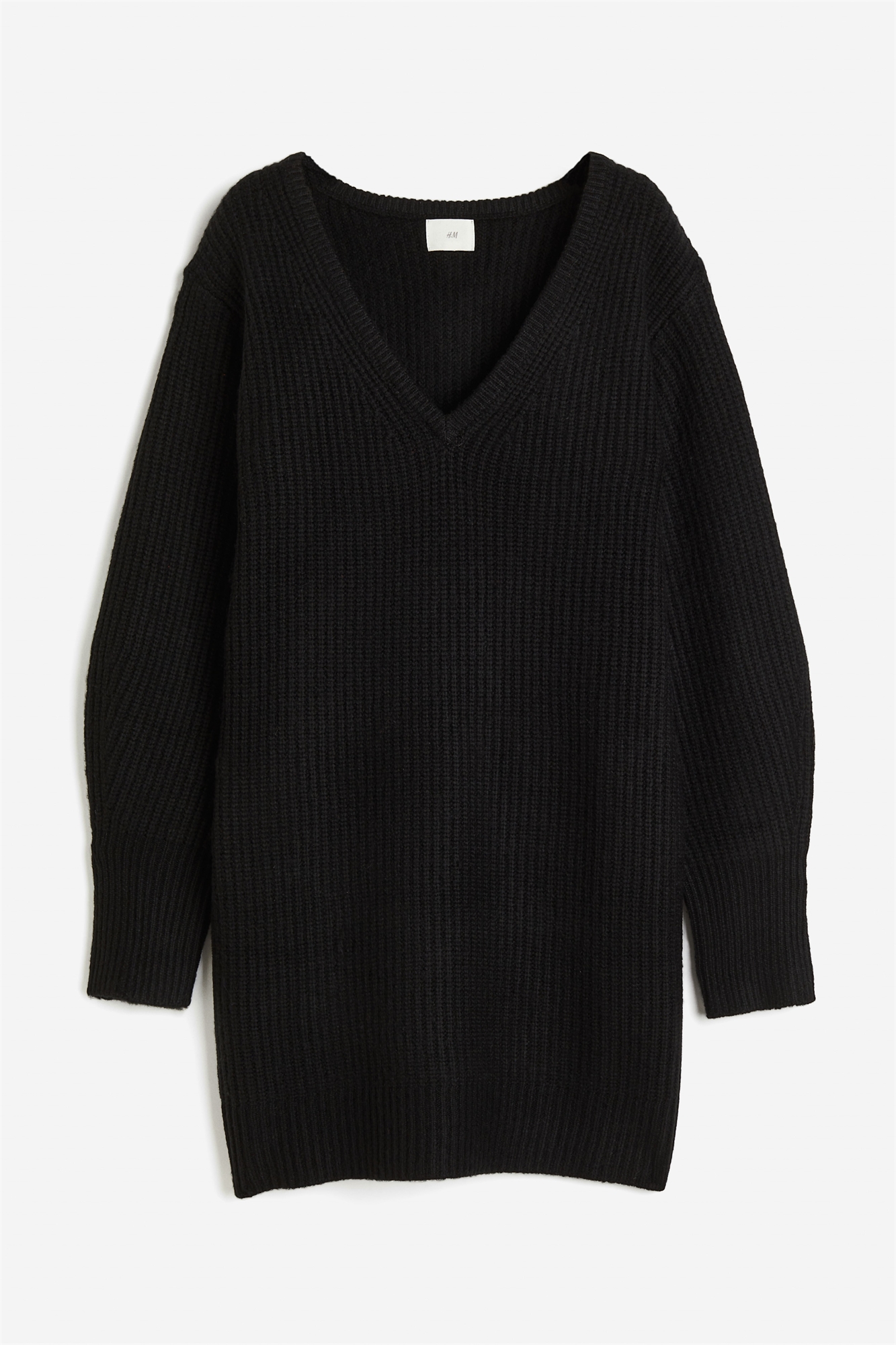 Короткое платье из мягкого трикотажа в рубчик с добавлением шерсти с V-образным вырезом, спущенными плечами и длинными широкими рукавами. Окантовка по вырезу, манжетам и подолу.