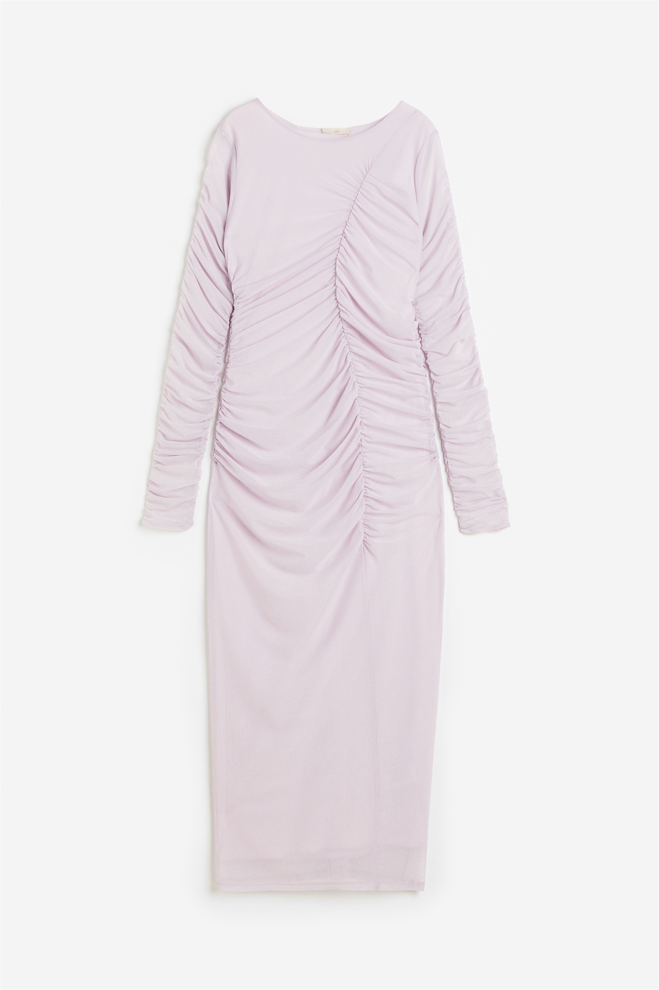 Приталенное платье из сетки длиной до щиколоток со сборчатыми швами, создающими эффект легкой драпировки. Круглый вырез и удлиненные рукава. Частично на подкладке.
