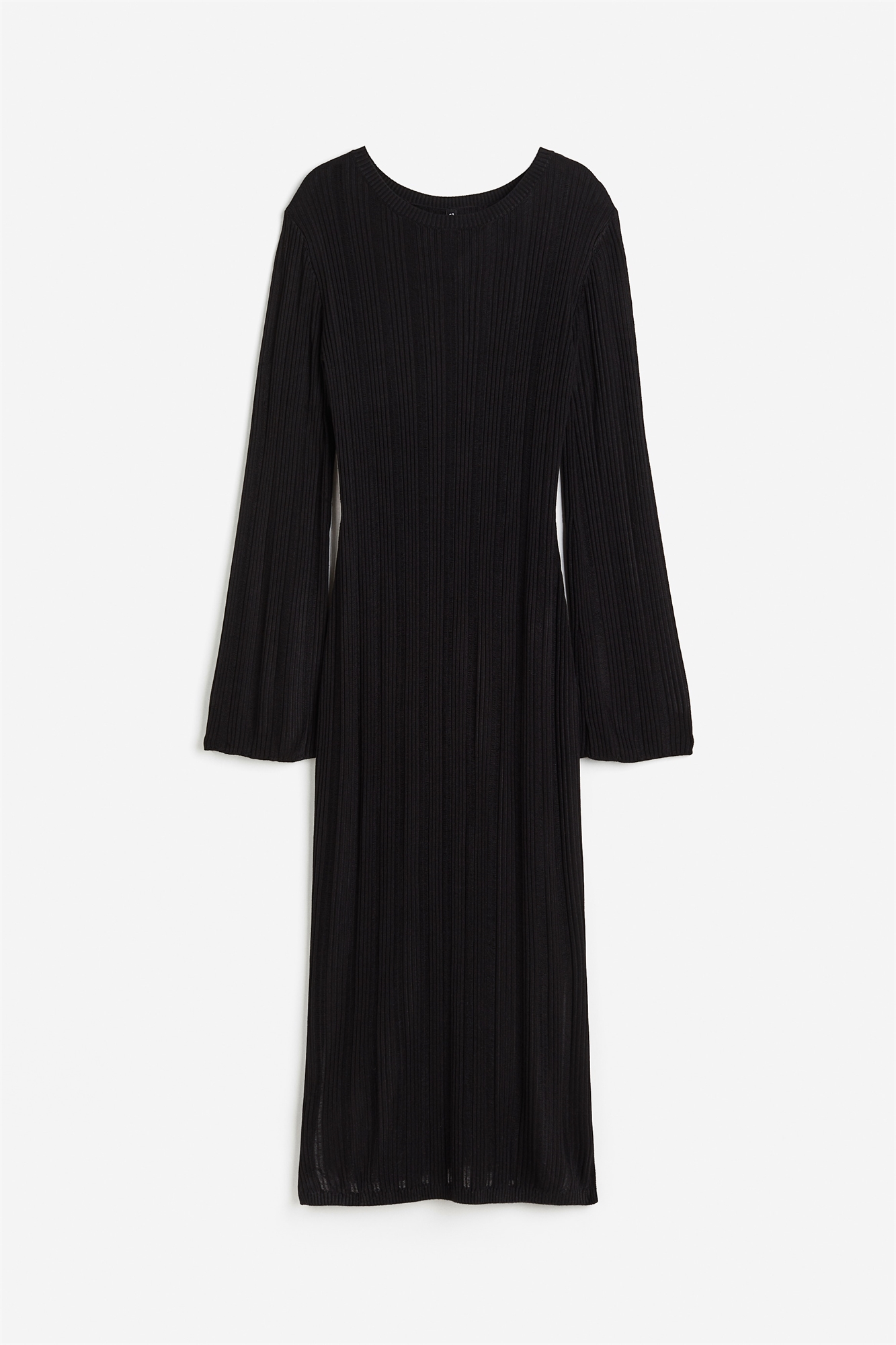 Обтягивающее фигуру платье из ребристого трикотажа длиной до колен, выполненное из мягкой вискозы. Модель с круглым вырезом и длинными расклешенными рукавами. Ребристая окантовка по вырезу и подолу.