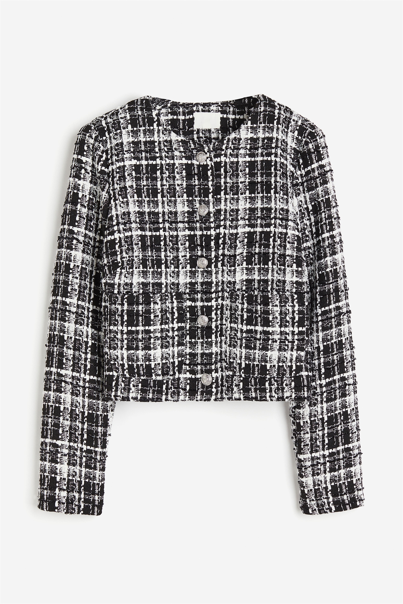 Короткий жакет из букле с круглым вырезом, пуговицами спереди, длинными рукавами и накладными карманами спереди. На подкладке.