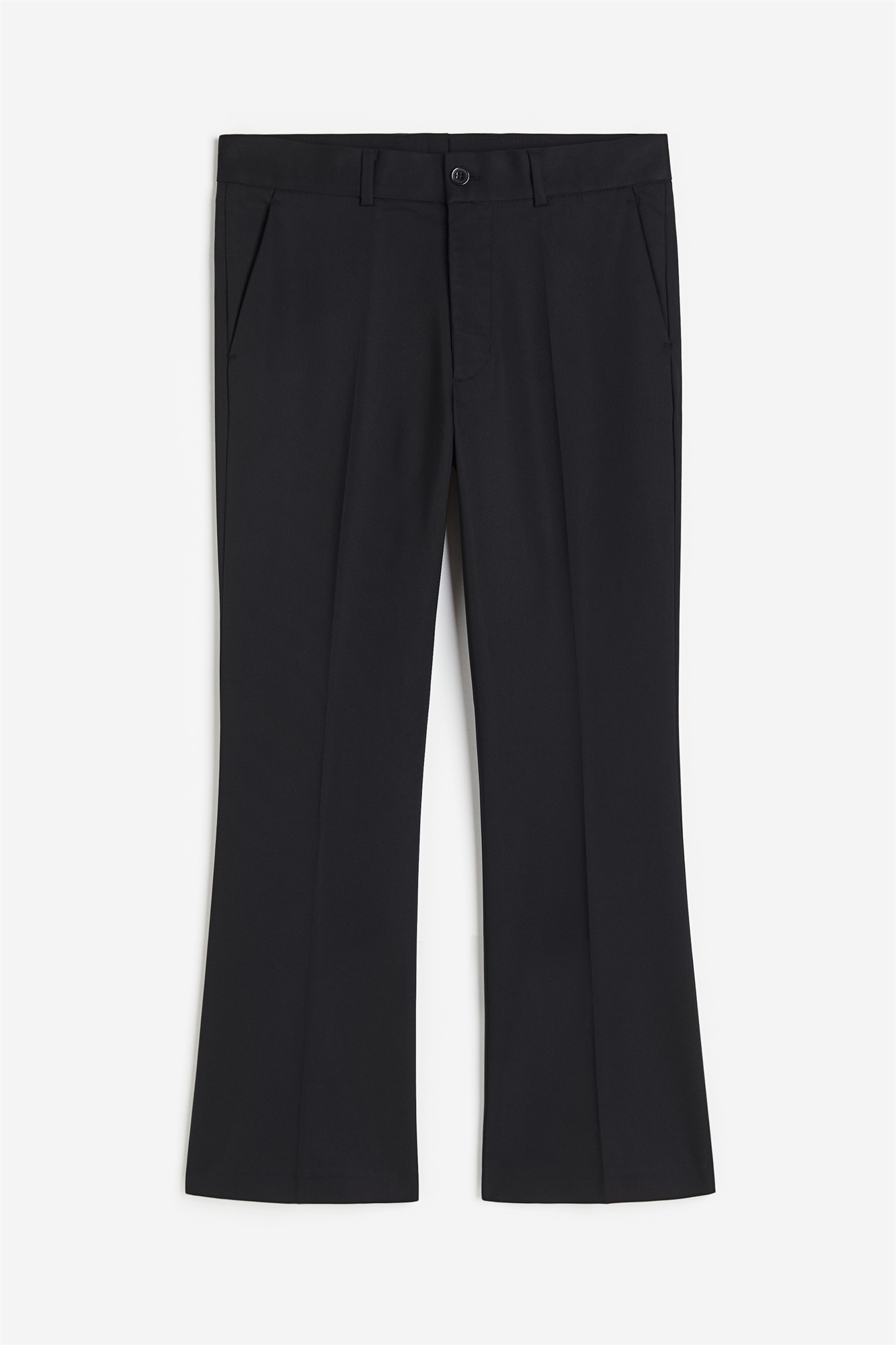 Брюки длиной до щиколотки из мягкой саржи, изготовленной из смеси хлопка. Регулярная талия, застежка на пуговицу и молнию. Зауженный крой с расклешенными ногами со складками.