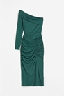 Приталенное платье без плеч из джерси длиной до колена, со сборкой и складками в верхней части и одним длинным рукавом. По бокам и спереди - сборчатые швы, создающие эффект драпировки.