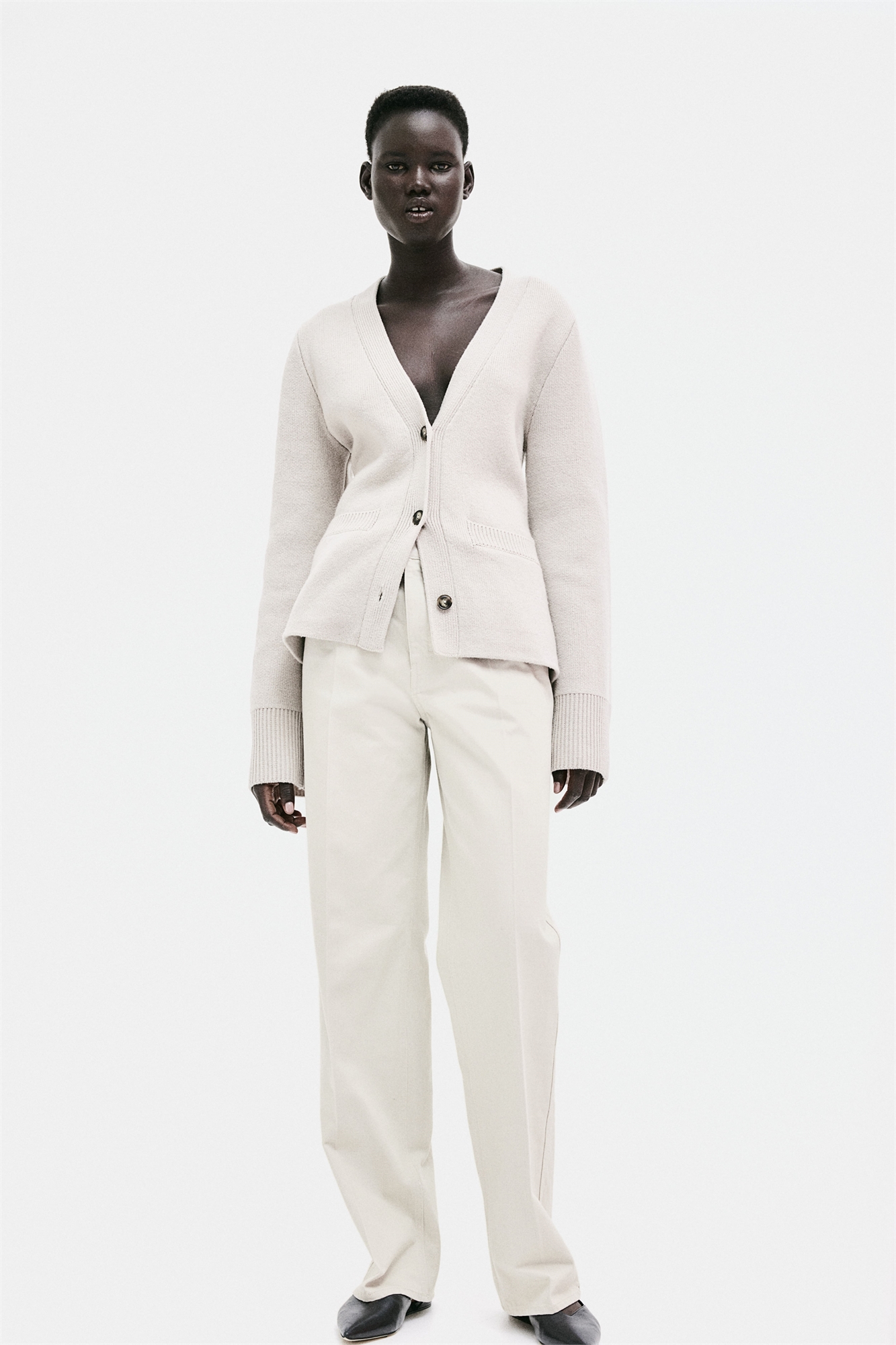 Брюки с 5 карманами из хлопковой саржи с высокой талией и ширинкой на молнии с потайной кнопкой. Удлиненные прямые ноги со складками.