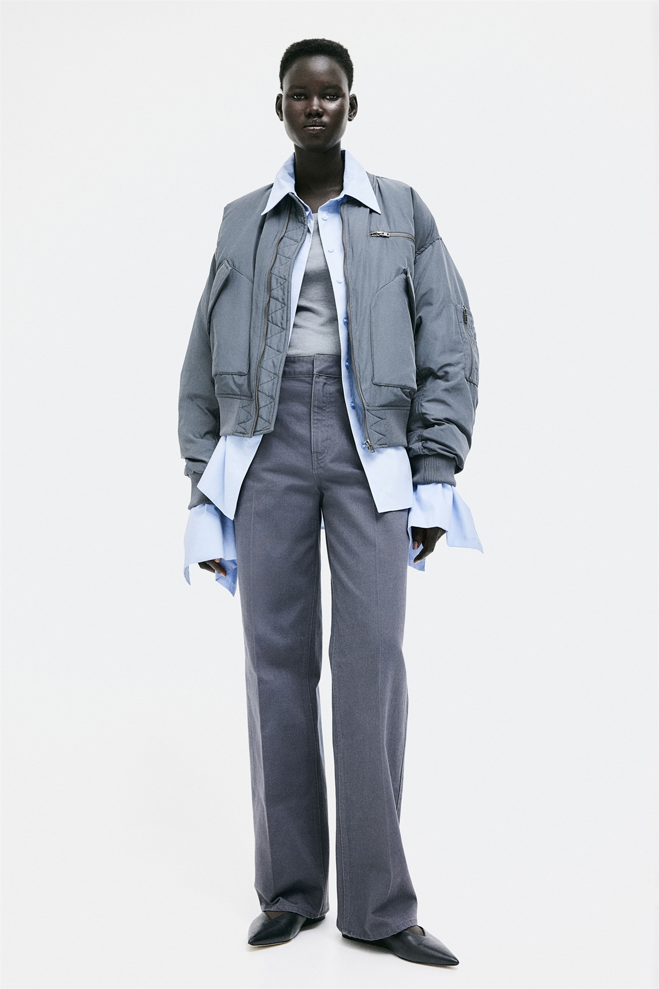 Брюки с 5 карманами из хлопковой саржи с высокой талией и ширинкой на молнии с потайной кнопкой. Удлиненные прямые ноги со складками.