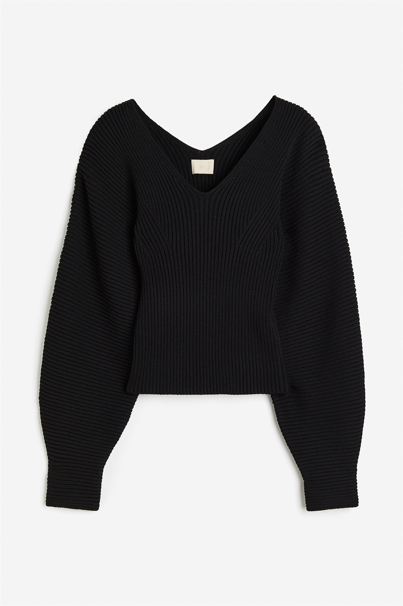 Джемпер из плотного трикотажа в рубчик с V-образным вырезом и длинными фигурными рукавами, сужающимися к манжетам.