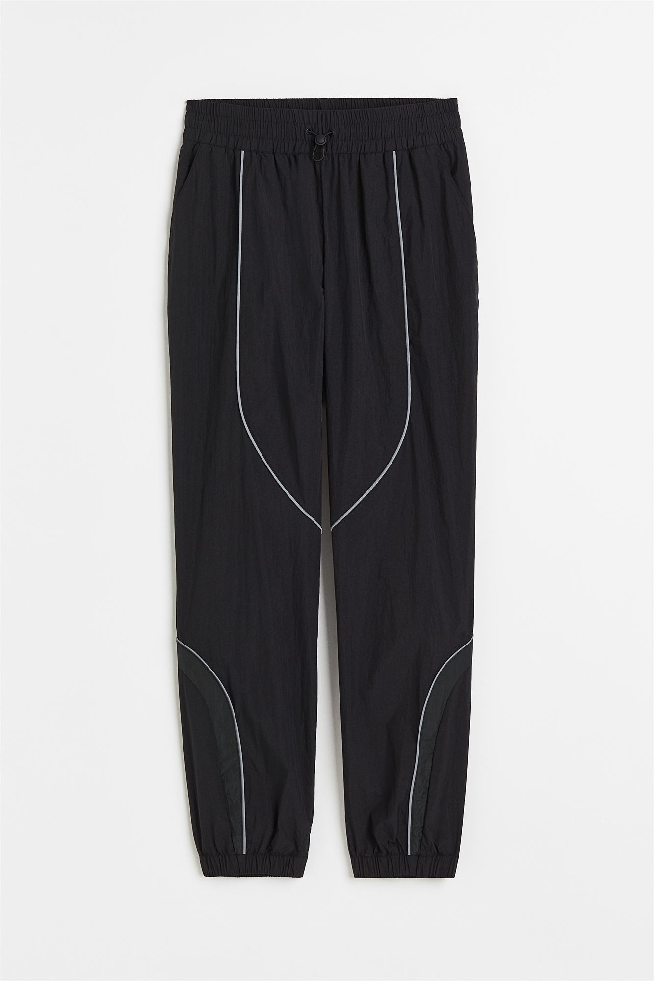 Спортивные брюки свободного кроя из ветрозащитной, водоотталкивающей функциональной ткани, которая не даст вам промокнуть во время небольшого ливня и защитит от ветра. Высокая талия с эластичным швом и эластичным шнурком с ограничителем спереди. Диагональные боковые карманы и зауженные штанины с эластичными вставками по краям. Светоотражающая отделка.