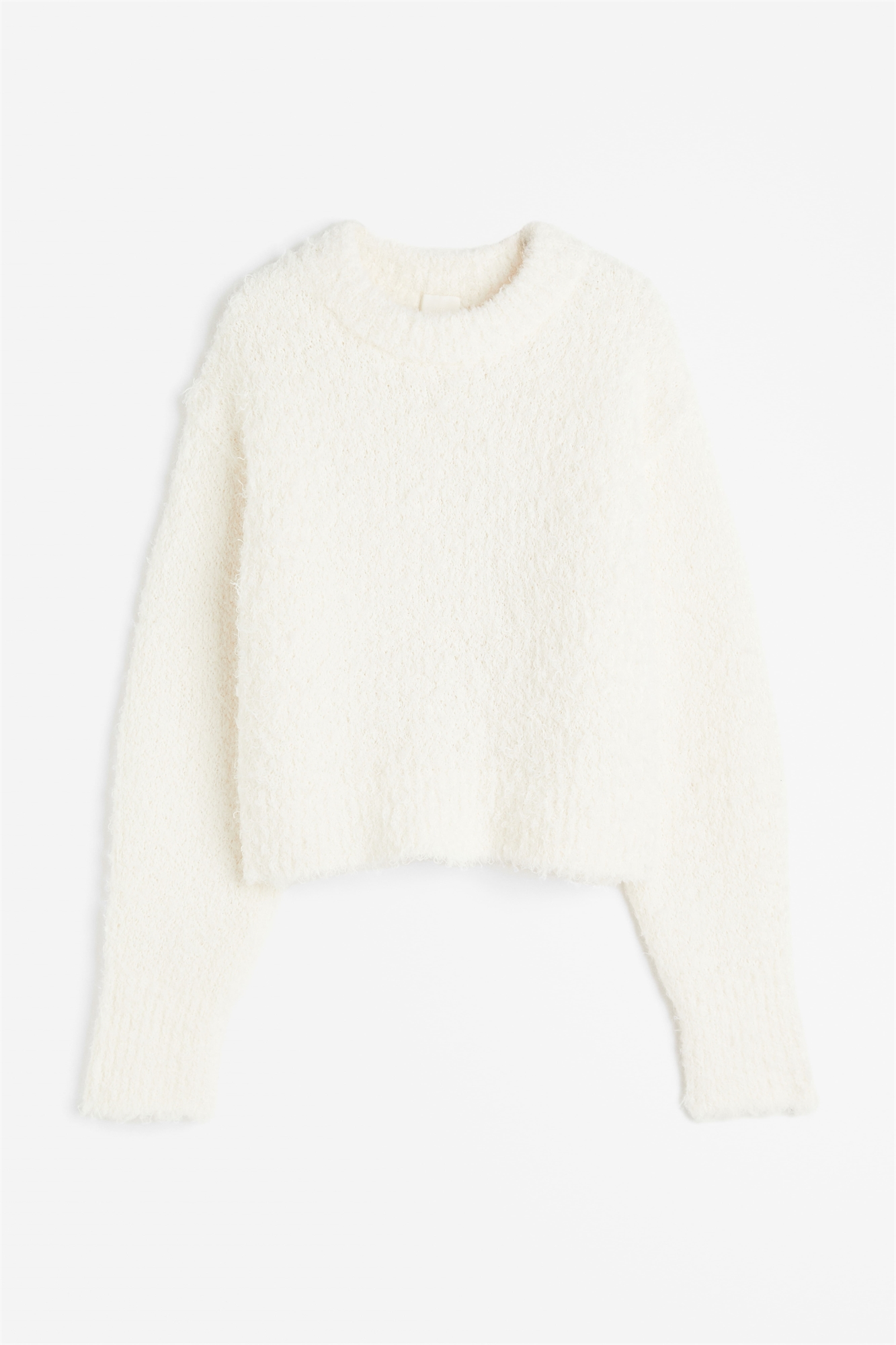 Короткий джемпер из мягкого пушистого трикотажа с круглым вырезом в рубчик, спущенными плечами и длинными рукавами. Ребристые манжеты и подол.