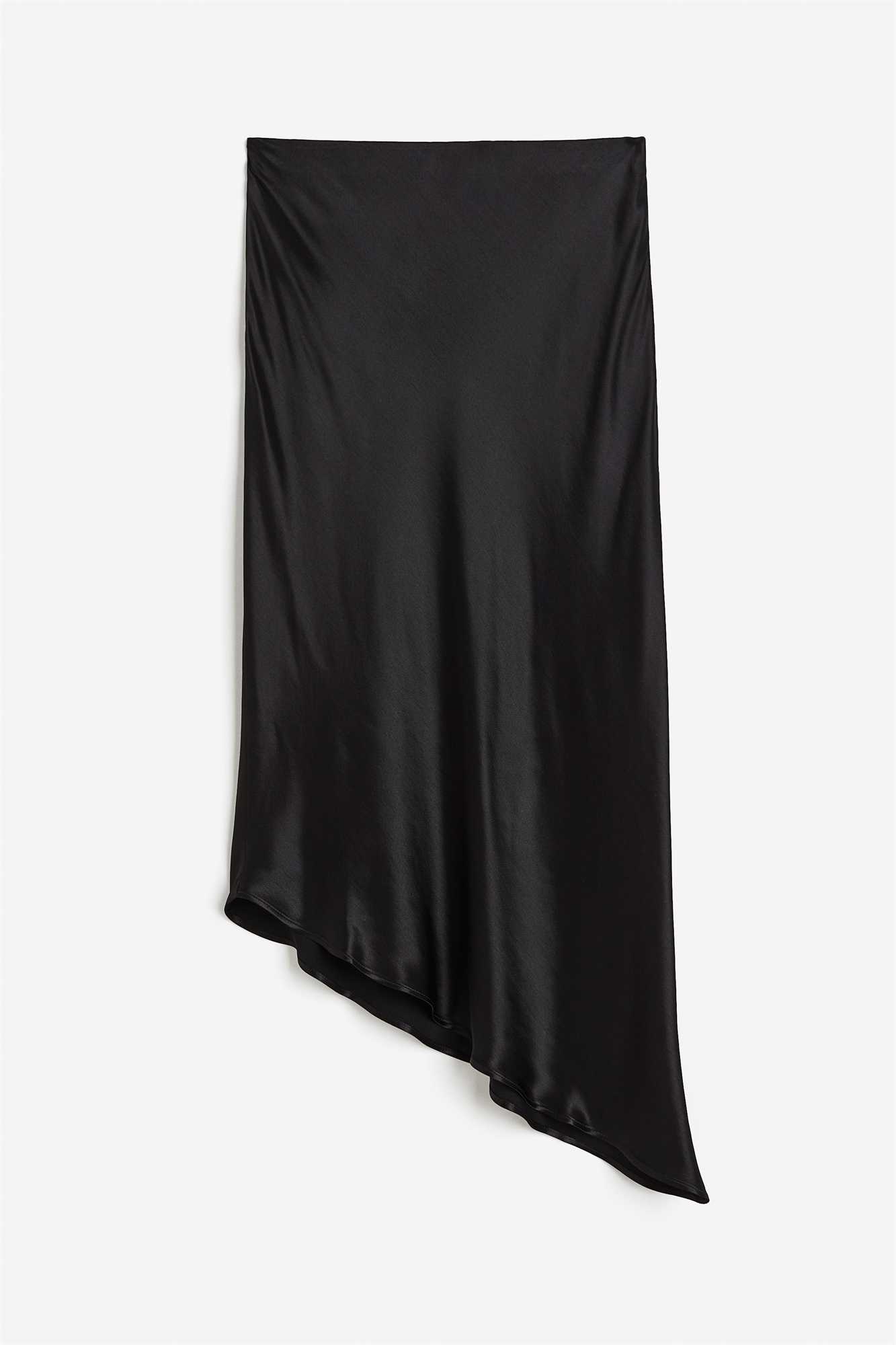 Приталенная юбка длиной до колен из мягко драпирующегося атласа с высокой эластичной талией и асимметричным подолом. Без подкладки.