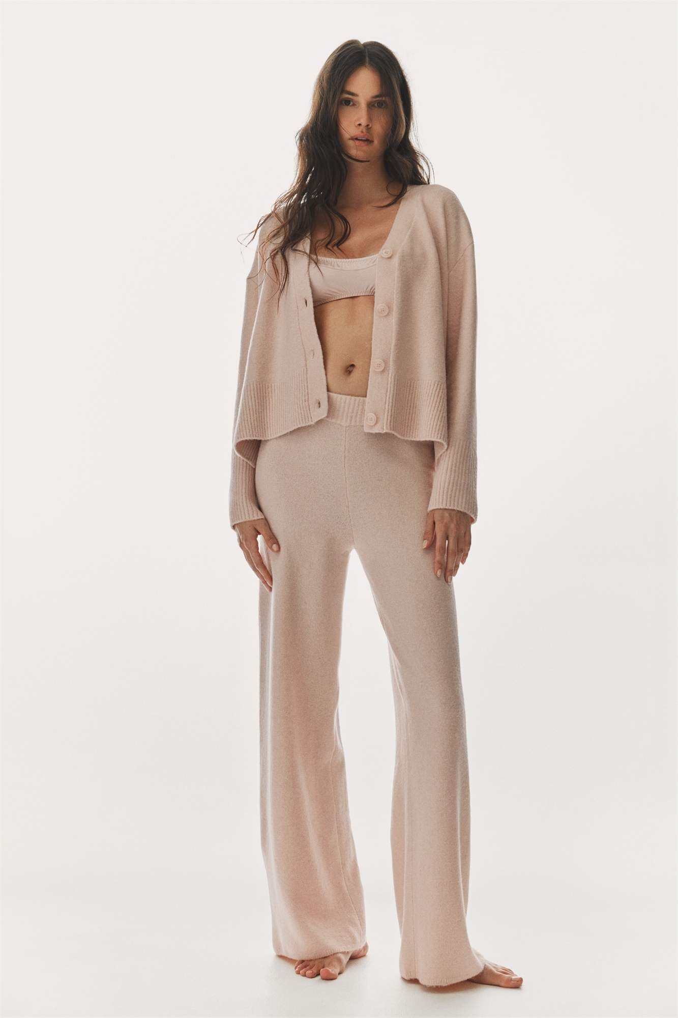 Брюки из мягкого, слегка начесанного трикотажа с небольшим содержанием шерсти. Высокая талия с утяжкой и прямые ноги.