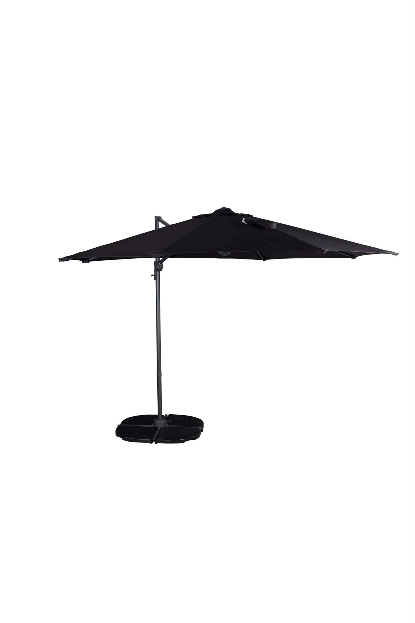 Прочный зонт черного цвета, может поворачиваться вокруг своей оси. Регулируемый, различных цветов, хорошо защищает от солнца и легко моется. Размеры: Диаметр: 300 см.