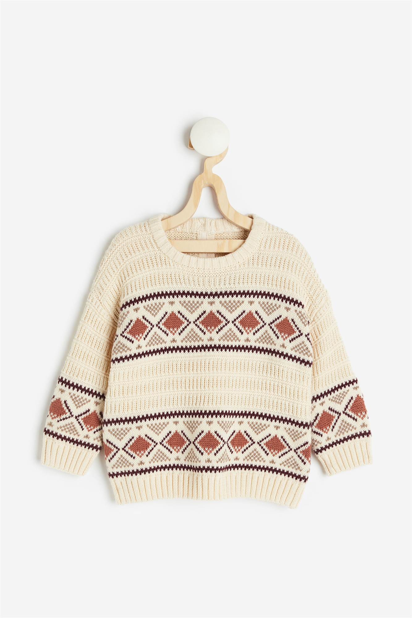 Baby Exclusive. Джемпер с длинными рукавами из мягкого хлопка жаккардовой вязки с пуговицами на горловине сзади, спущенными плечами и тесемками по вырезу, манжетам и подолу.