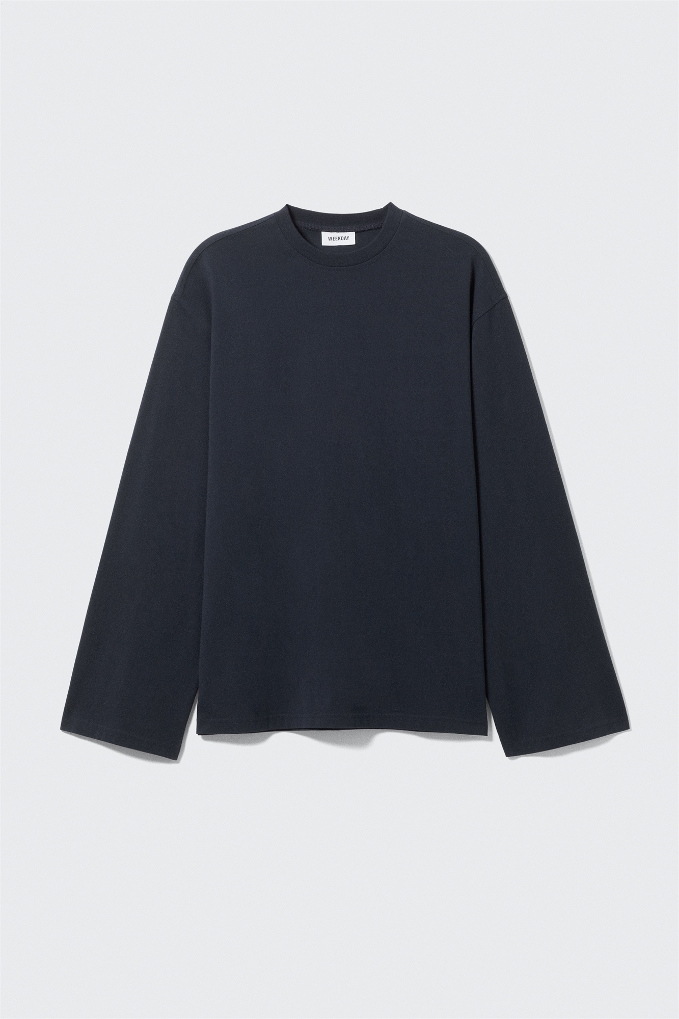 Длинная футболка с длинными рукавами оверсайз из мягкого хлопка джерси. У нее очень длинные просторные рукава, ребристый круглый вырез и подогнутые края.
