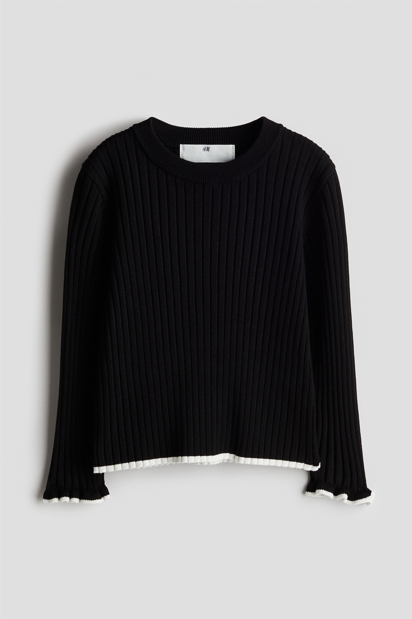 Джемпер из мягкого трикотажа в рубчик с круглым вырезом в рубчик, спущенными плечами и длинными рукавами с оборкой на манжетах.