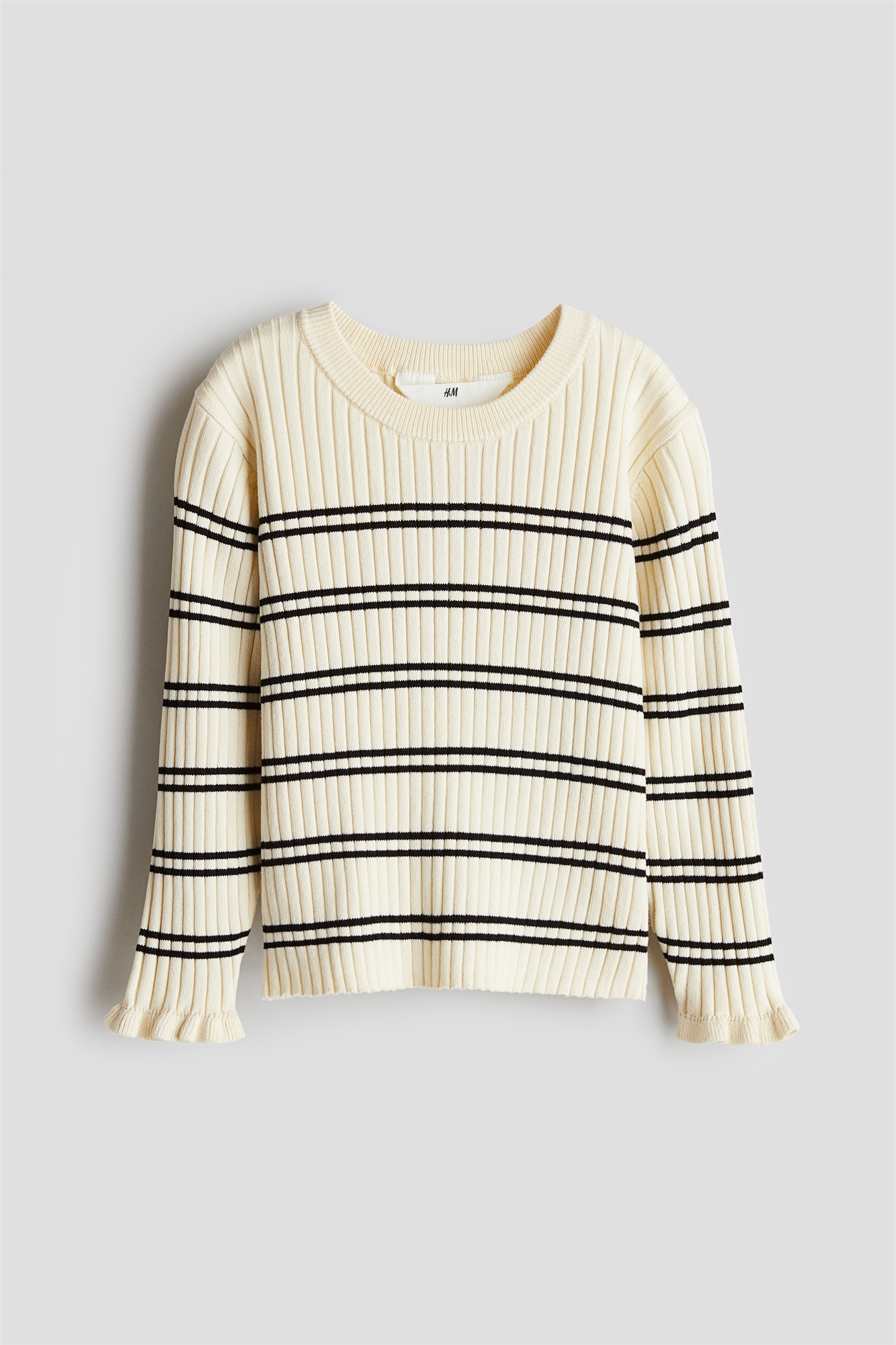 Джемпер из мягкого трикотажа в рубчик с круглым вырезом в рубчик, спущенными плечами и длинными рукавами с оборкой на манжетах.