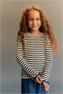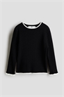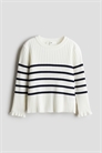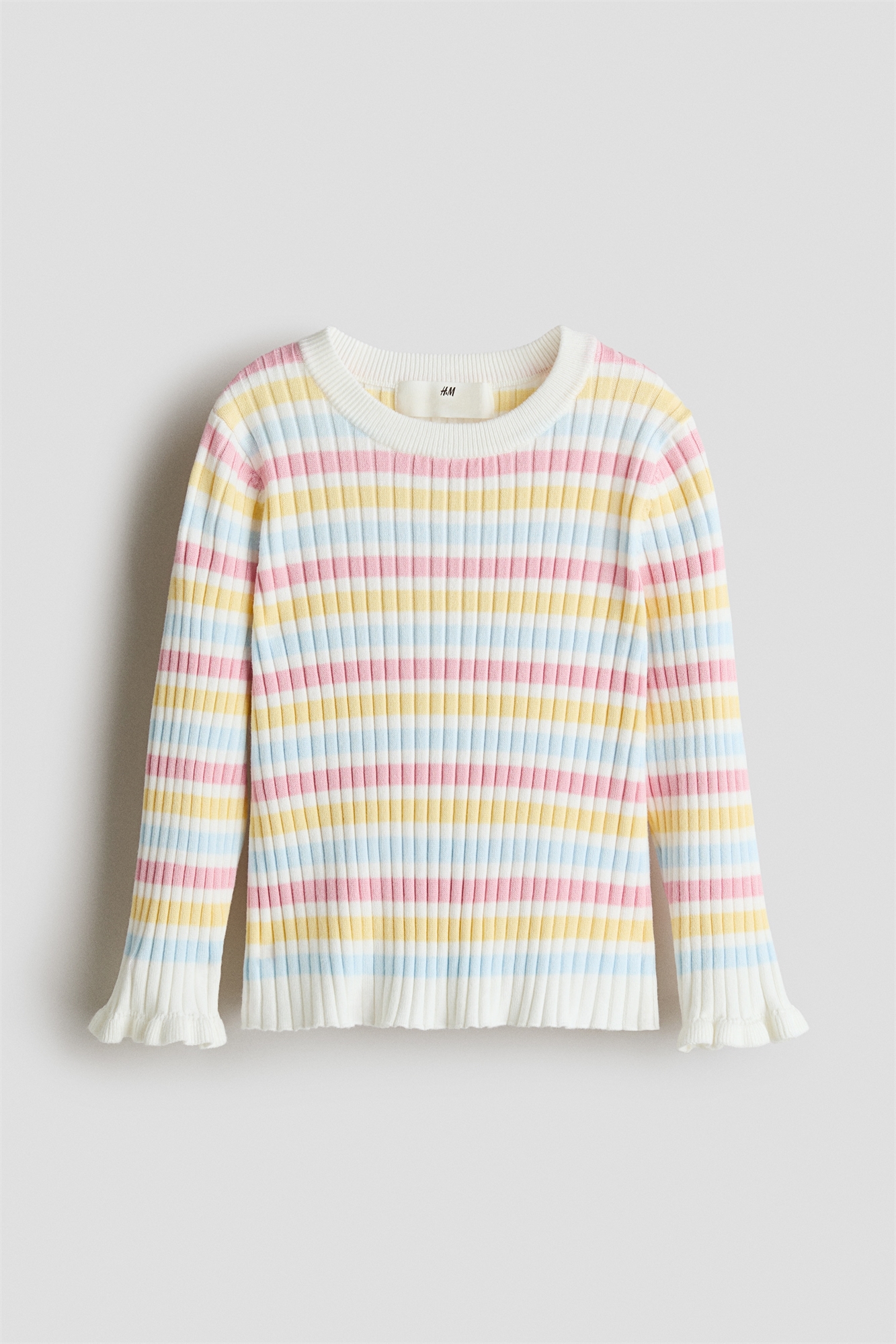 Джемпер из мягкого трикотажа в рубчик с круглым вырезом в рубчик, спущенными плечами и длинными рукавами с оборкой на манжетах.