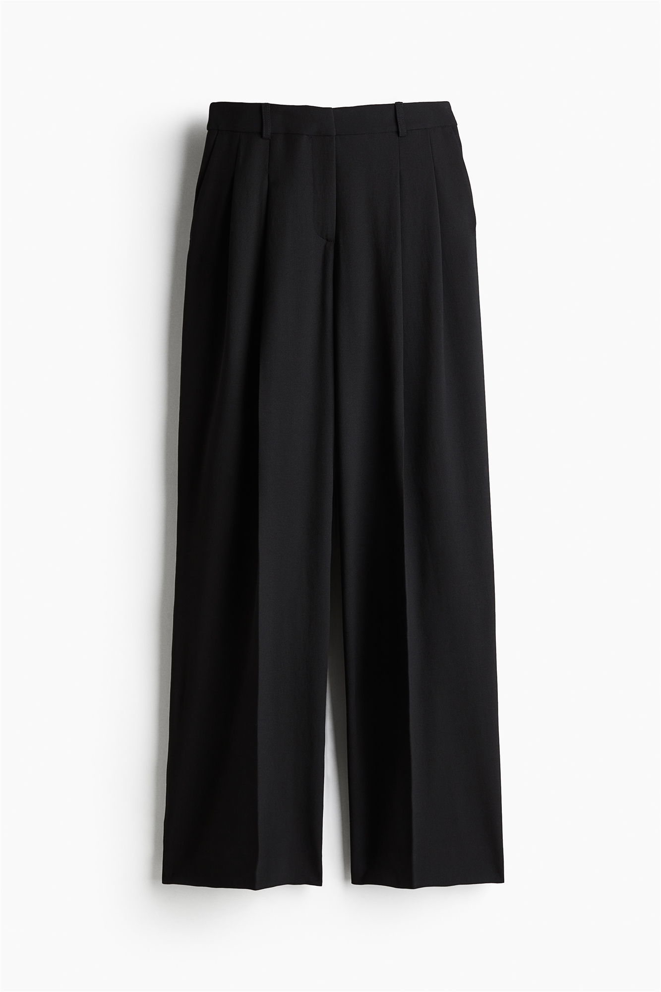 Свободные приталенные брюки из тканого материала. Высокая талия, ширинка на молнии, потайная застежка на пуговицах и крючках. Диагональные боковые карманы, втачные задние карманы и широкие прямые ноги со складками спереди и складками спереди и сзади.