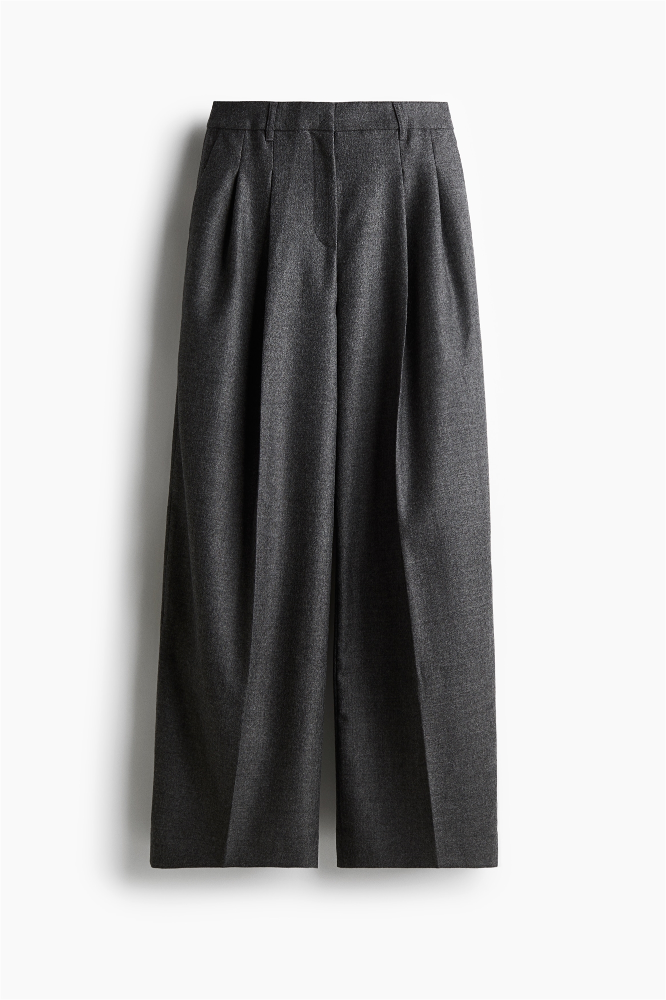 Свободные приталенные брюки из тканого материала. Высокая талия, ширинка на молнии, потайная застежка на пуговицах и крючках. Диагональные боковые карманы, втачные задние карманы и широкие прямые ноги со складками спереди и складками спереди и сзади.