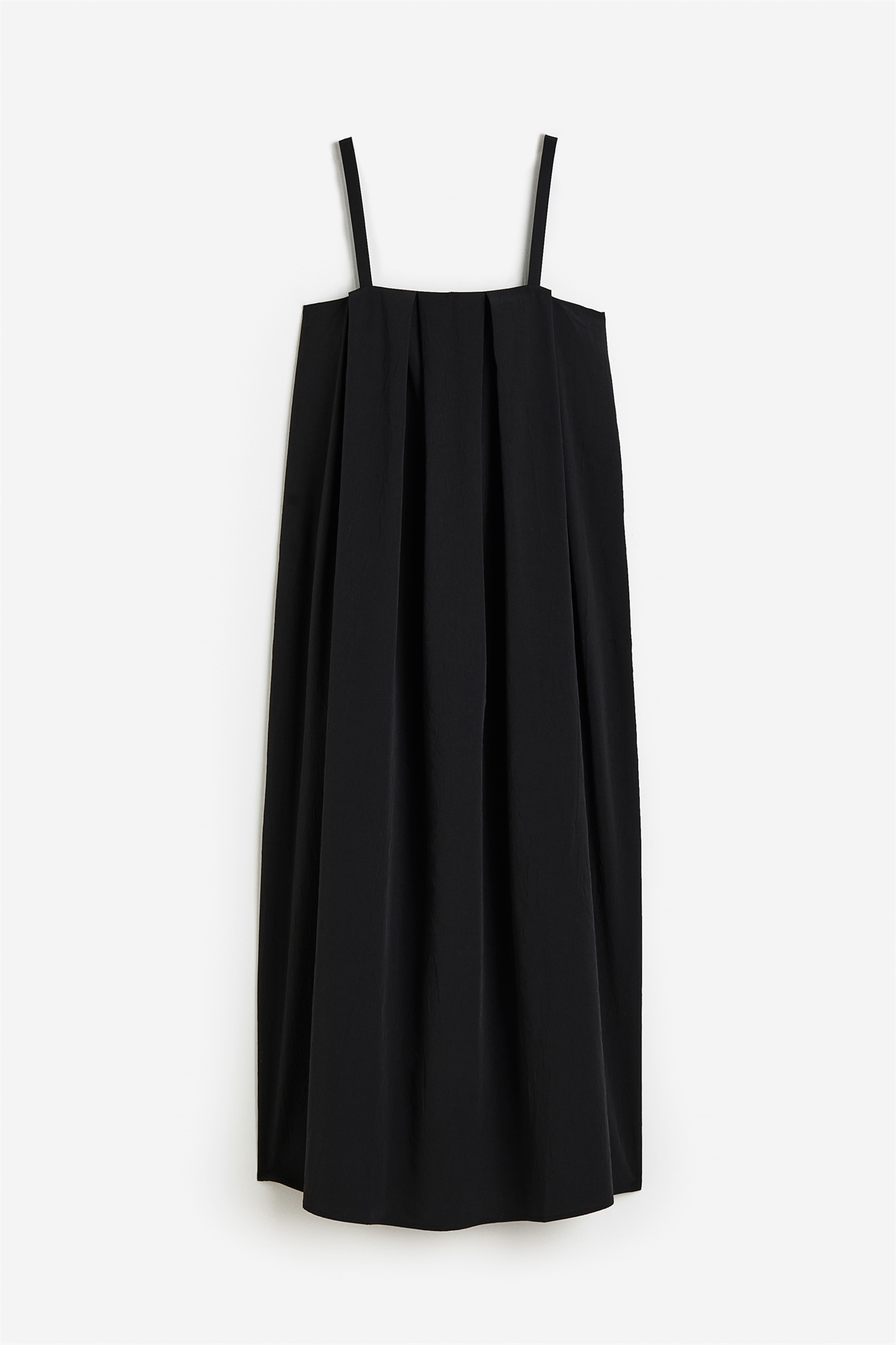 Платье длиной до щиколоток и без рукавов из мятого атласа. Свободный крой с узкими бретелями, квадратным вырезом и складками в верхней части. Без подкладки.