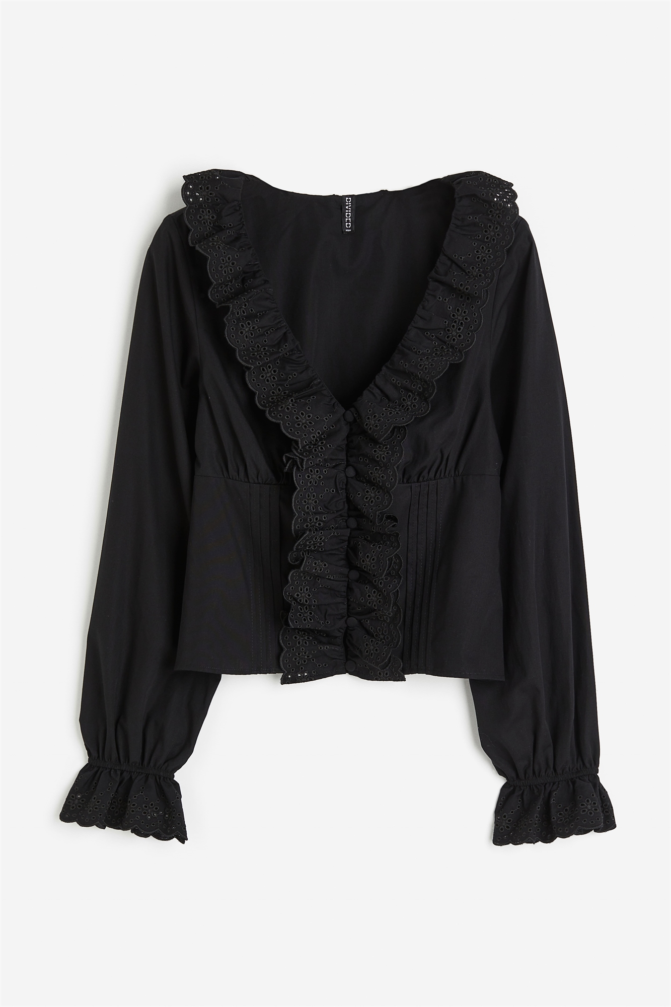 Блузка из нескользящего хлопкового поплина с глубоким V-образным вырезом, застежкой на пуговицы спереди, сборкой в ампирном шве, складками спереди и длинными рукавами с узкими эластичными манжетами. Воланы с гребешковыми краями и бродери-англиз по вырезу, спереди и на концах рукавов.