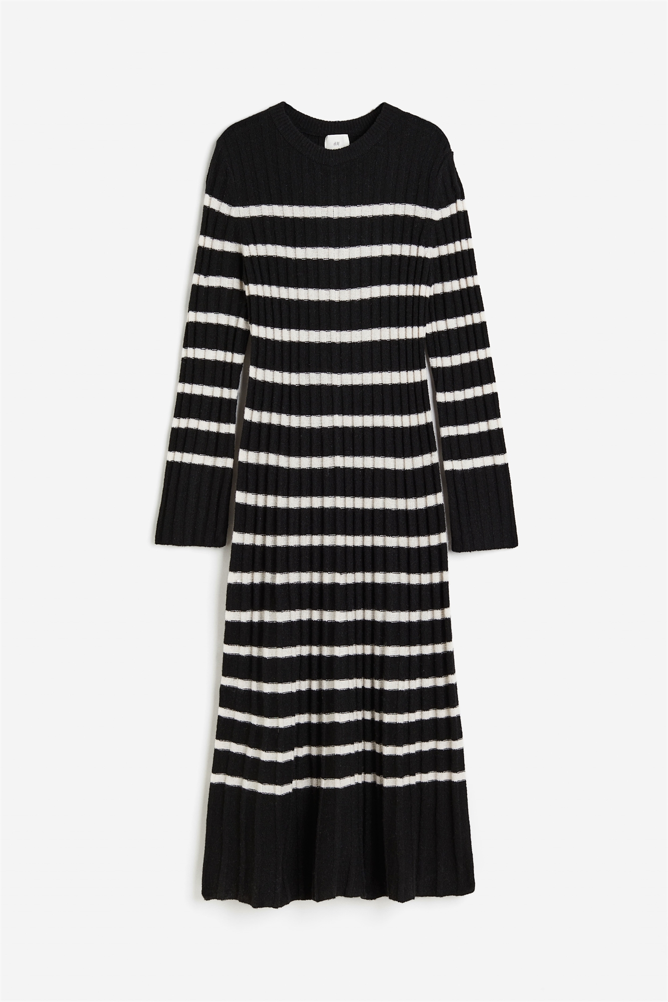 Приталенное платье длиной до колен из мягкого трикотажа в рубчик с добавлением шерсти. Круглый вырез, длинные рукава и расклешенная юбка.