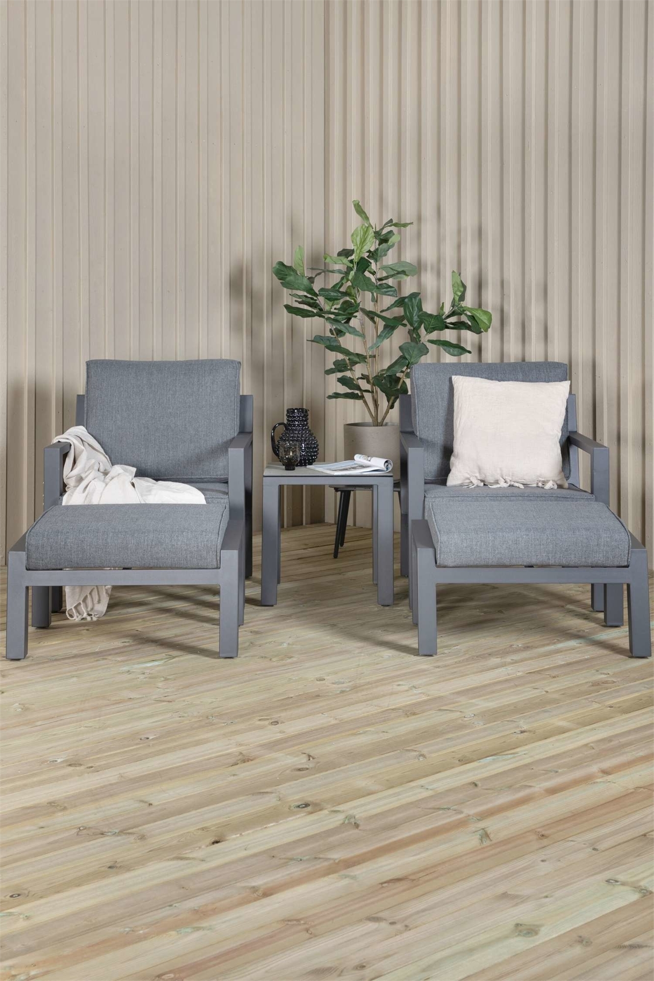 Создайте привлекательный интерьер, который будет впечатлять, с помощью удобного комплекта для гостиной из серии Barcelona. Состоит из двух шезлонгов из прочного алюминия черного цвета и подходящего к ним столика со стильной стеклянной столешницей. В комплект входят износостойкие подушки черного цвета. Сборка не требуется. Здесь вы можете расслабиться и насладиться летним отдыхом на балконе! Стол: высота: 50 см, ширина: 50 см, длина: 50 см | Диван: глубина: 84 см, высота: 77 см, ширина: 75 см.