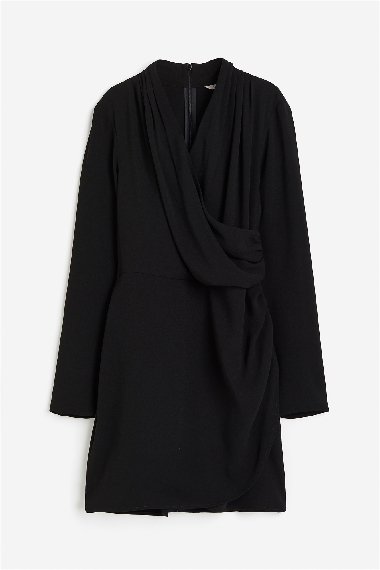 Короткое платье из тканого материала с V-образным вырезом горловины и пришитой оберткой спереди. Длинные рукава и потайная застежка-молния сзади. Эластичный шов сзади на талии и сборки с одной стороны для драпировки. Без подкладки.