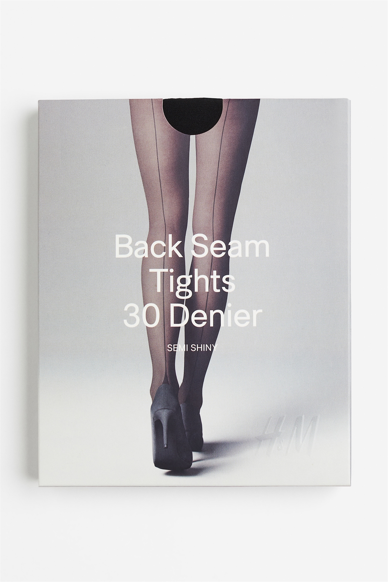 Полублестящие колготки с высокой талией и швом по задней части ног.