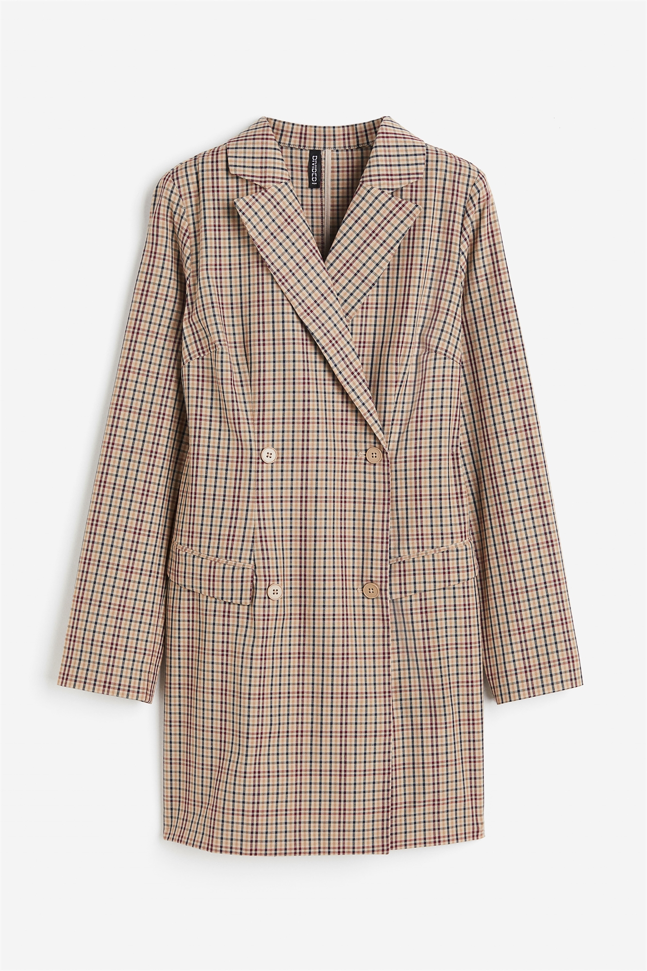 Короткое, приталенное, двубортное платье-блейзер с лацканами с вырезом. Пуговицы и потайная кнопка спереди, длинные рукава и накладные передние карманы. Без подкладки.