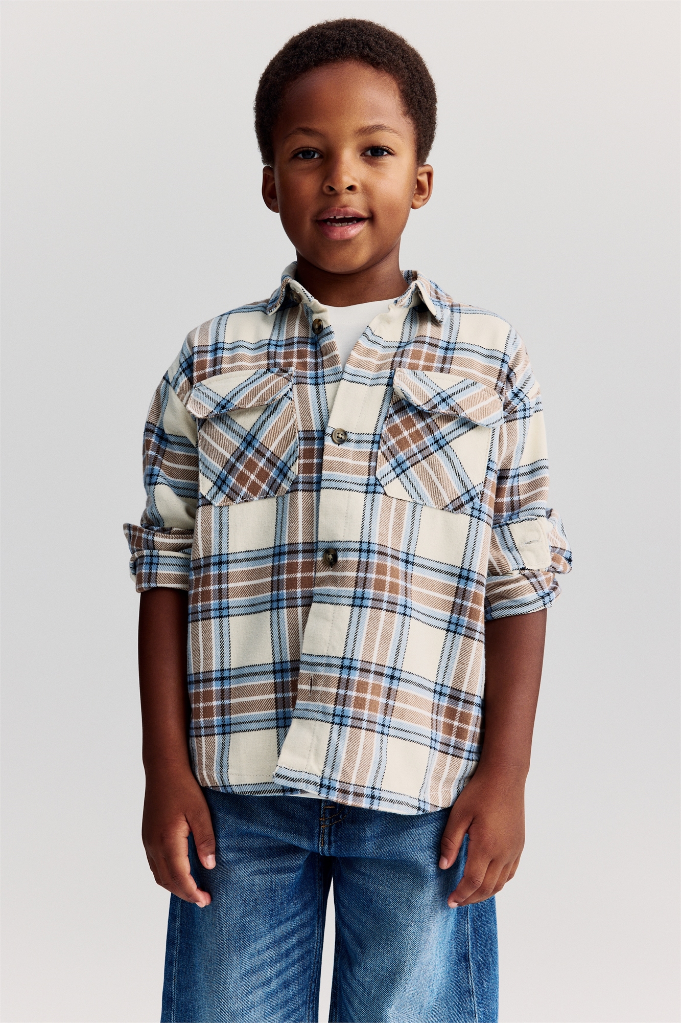 Рубашка оверсайз из мягкой хлопковой саржи с воротником, застежкой на пуговицы спереди и ярмом сзади. Длинные рукава с манжетами на пуговицах, спущенные плечи и накладные нагрудные карманы.