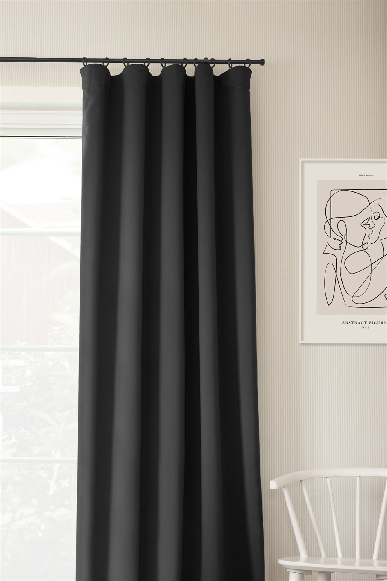 Затемняющая штора из мягкой ткани, которая хорошо держится. Штора затемняет комнату, но не является на 100% непрозрачной. Комбинированная лента с четырьмя вариантами подвешивания шторы: на карниз с люверсами, с крючками для пальцев, с крючками для плиссированной ленты или современной подвеской "волна". Крючки в комплект не входят. В упаковке содержится одна длина шторы.