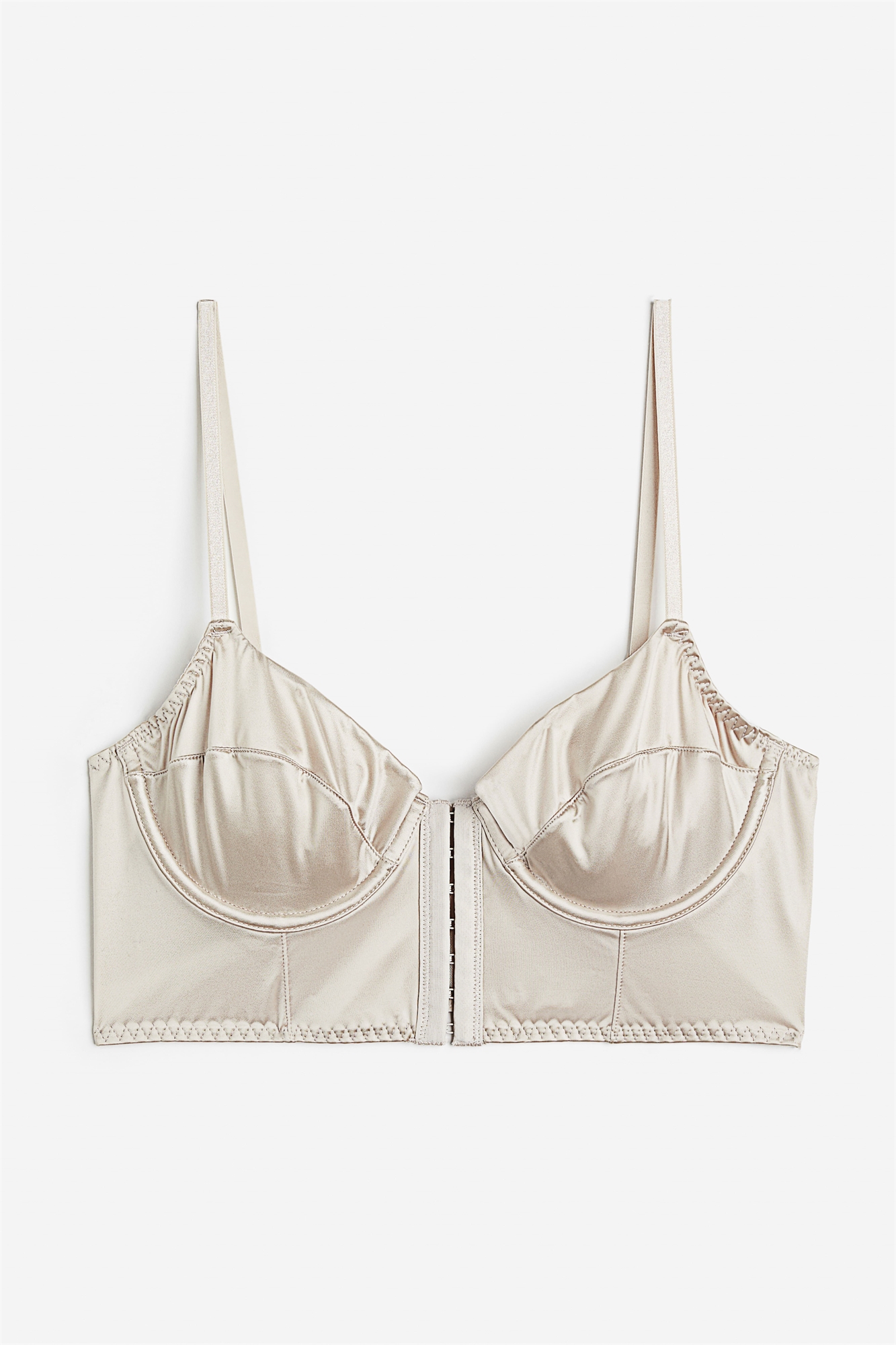 Бюстье без подкладки с чашечками из сетчатой ткани, которые придают бюсту естественную форму и обеспечивают легкую поддержку. Регулируемые бретели, узкая эластичная резинка по верху и подолу и широкая застежка-крючок спереди.