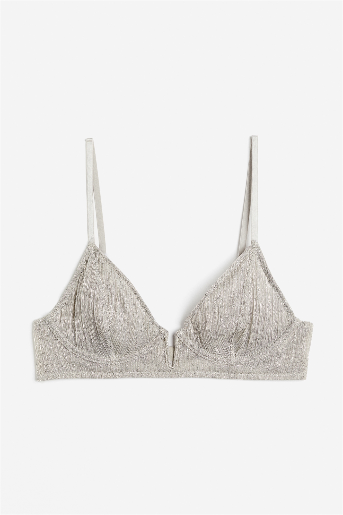 Бюстгальтер без подкладки из сетки с блестящими нитями с регулируемыми бретелями, V-образными косточками спереди и чашечками с сетчатой подкладкой, которые придают бюсту естественную форму и обеспечивают легкую поддержку. Застежка на крючки и глазки сзади.