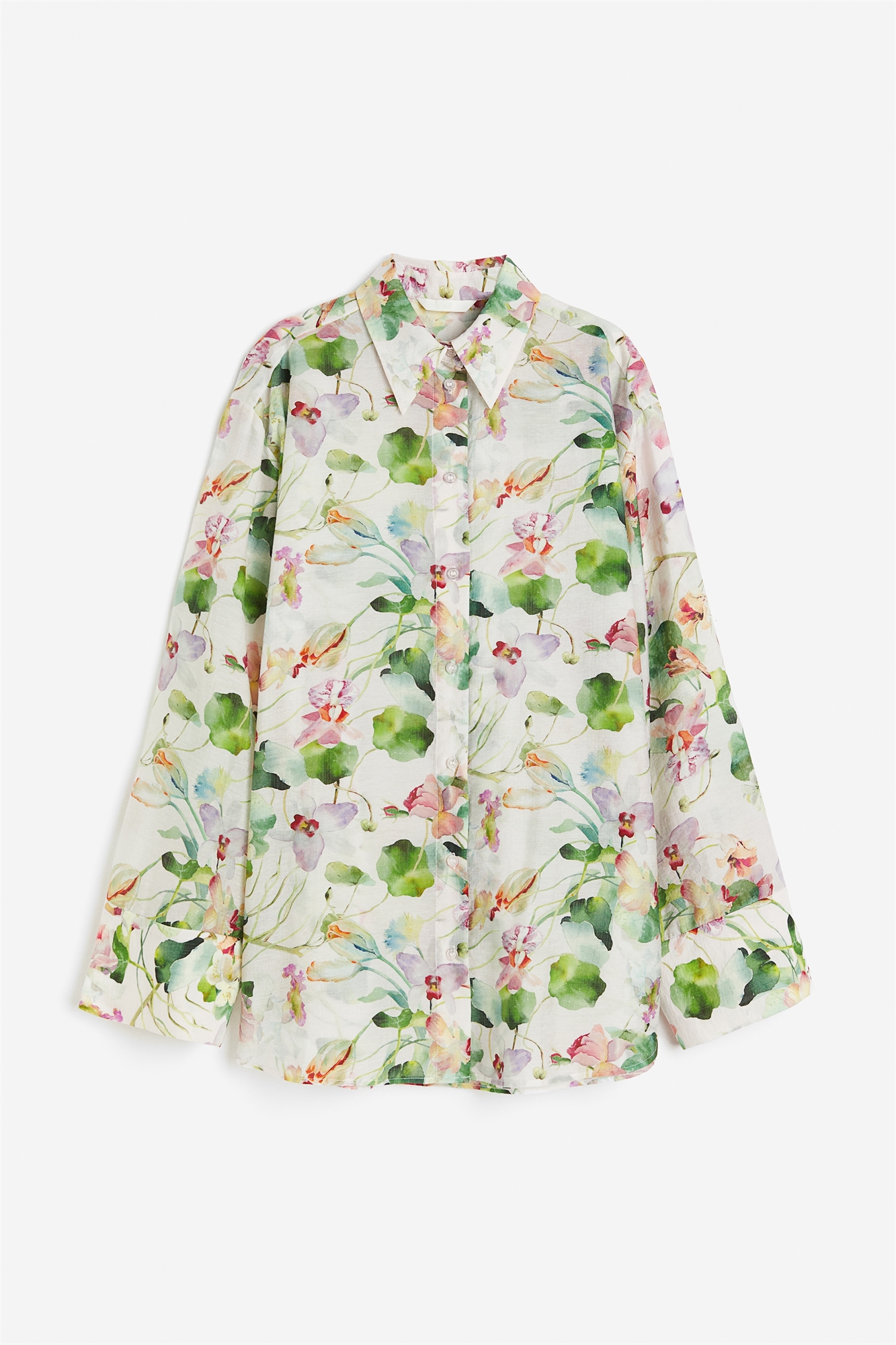 Свободная рубашка из тканого материала из смеси лиоцелла. Заостренный воротник, застежка на пуговицы спереди и двухслойная стойка с коробчатой складкой сзади. Слегка спущенные плечи, длинные рукава с манжетами на пуговицах и рукавной планкой с пуговицей. Аккуратный закругленный подол.
