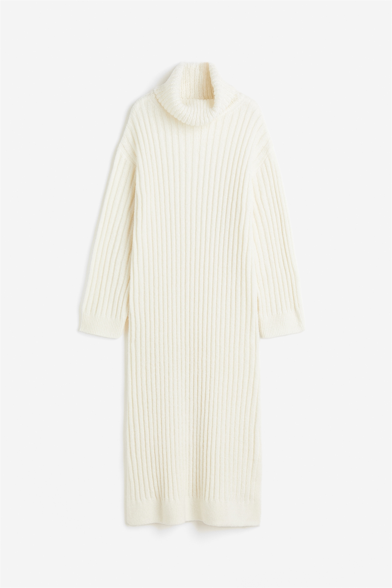 Платье из мягкого трикотажа в рубчик с горловиной поло, спущенными плечами, длинными рукавами и узкой тесьмой на манжетах и подоле. Прямой подол с высоким разрезом с каждой стороны.