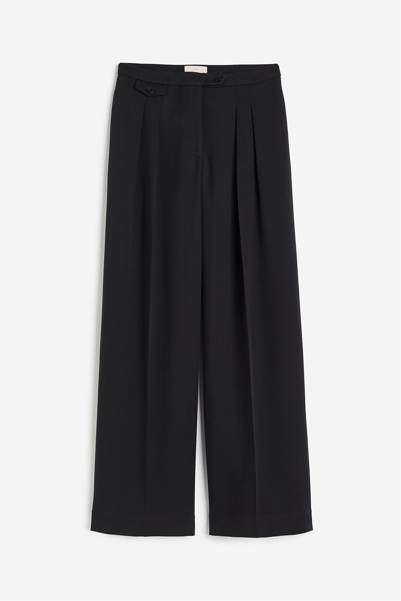 Приталенные брюки из тканого материала из смеси шерсти и лиоцелла. Высокая талия, застежка на молнию и удлиненный пояс с одной видимой и одной потайной пуговицей. Маленький передний карман с клапаном и пуговицей, карманы в боковых швах и накладные задние карманы с пуговицей. Широкие прямые ноги со складками в верхней части и складками спереди и сзади.