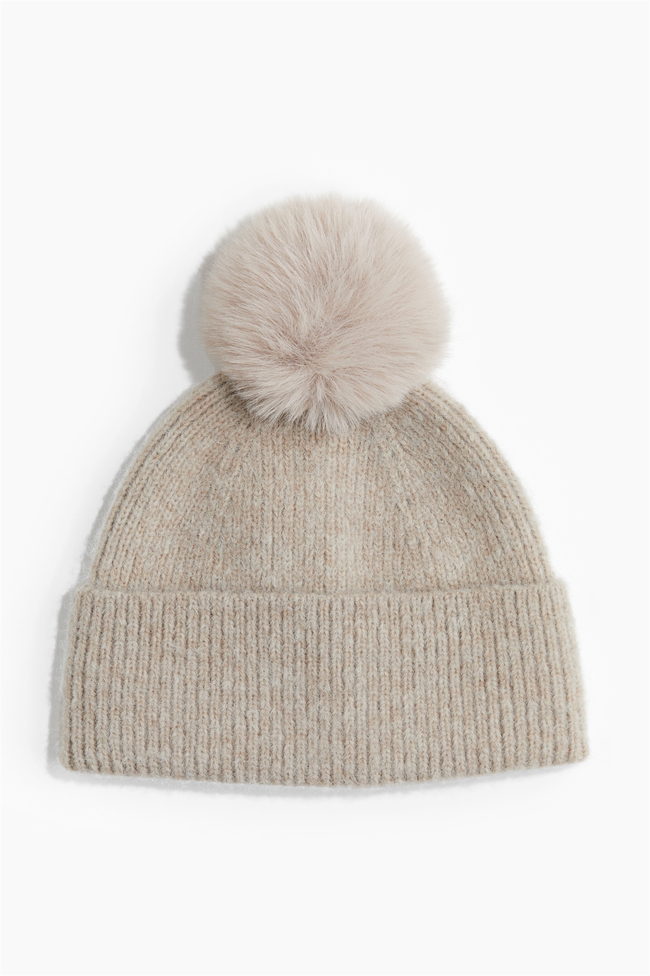 Шапка из мягкого трикотажа в рубчик с пушистым помпоном на макушке и отворотом на подоле.