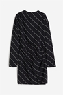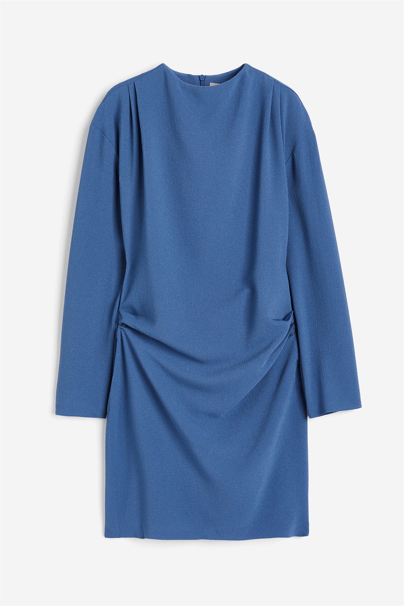 Короткое платье из тканого материала с небольшим воротником-стойкой и потайной застежкой-молнией сзади. Длинные рукава и складки на талии, создающие эффект легкой драпировки. Без подкладки.